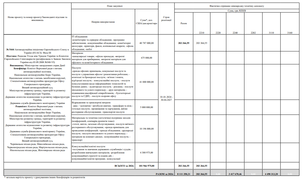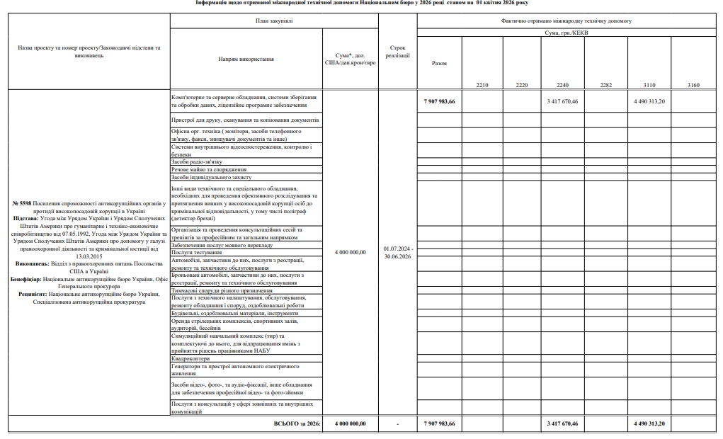 Інформація щодо отриманої міжнародної технічної допомоги Національним бюро у 2026 році станом на 01 квітня 2026 року