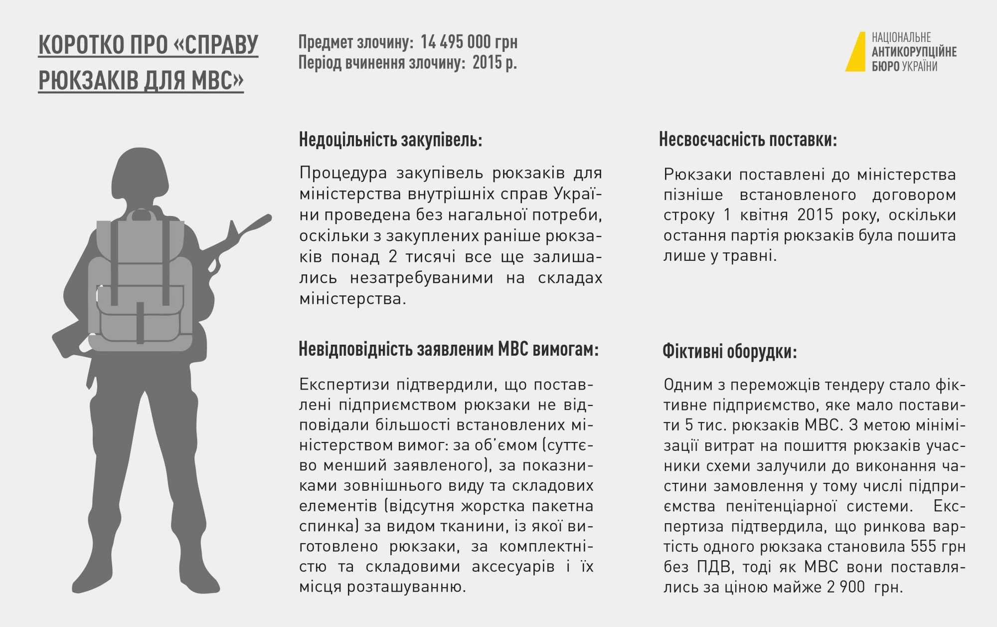 Це при тому, що у той момент на складах МВС вже знаходилося 2000 невикористаних рюкзаків. Організатор домовився про виготовлення рюкзаків з підприємцем Л., який, у свою чергу, знайшов ТОВ з ознаками фіктивності для участі у переговорній процедурі закупівлі з МВС. Завдяки зв’язкам підозрюваного А. ця ТОВ отримала контракт на постачання 5000 рюкзаків за ціною 2899 грн за одиницю. До контракту додавався перелік вимог до рюкзаків щодо розміру, тканини, кишень, клапанів, ортопедичних властивостей тощо. ТОВ, яка отримала контракт, по факту існувала лише для обміну документами. Насправді рюкзаки шили у кустарний спосіб декілька приватних підприємців, а також підприємства пенітенціарної системи. У березні-травні 2015 року приватний підприємець Л. фактично поставив до МВС 5000 рюкзаків, які за документами нібито надійшли від ТОВ. МВС прийняло рюкзаки і сплатило ТОВ майже 14,5 мільйонів гривень, які згодом через низку фіктивних підприємств були конвертовані у готівку. В результаті МВС із запізненням отримало неякісну продукцію, яка не відповідає вимогам, встановленим самим Міністерством, витративши при цьому 14,5 млн грн бюджетних коштів.