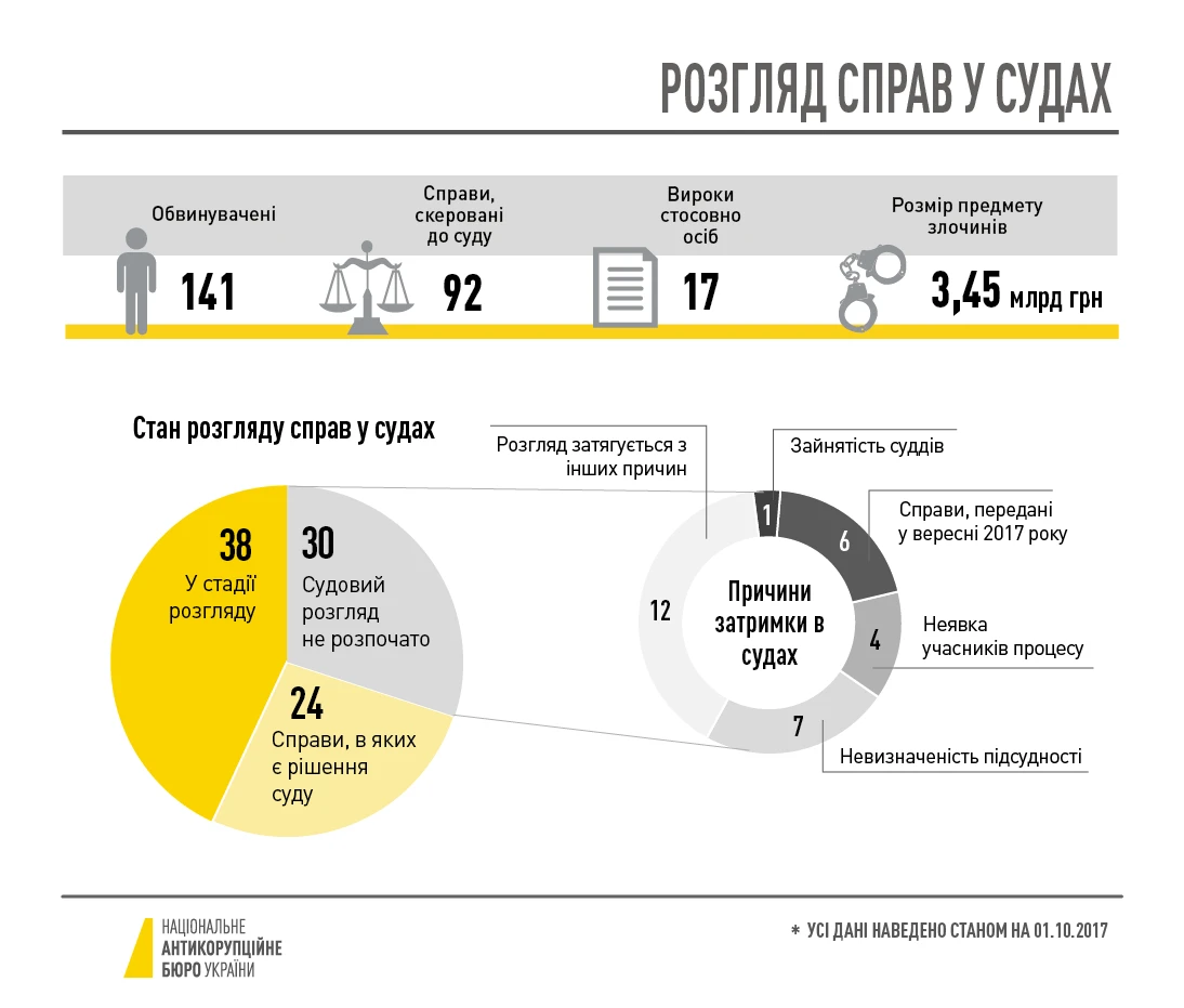 У 30 провадженнях, в яких детективи Національного антикорупційного бюро України завершили досудове розслідування, а прокурори САП скерували обвинувальний акт до суду, судовий розгляд досі не розпочато. 80% цих проваджень перебувають у суді понад місяць. Майже кожна друга із цих справ перебуває поза увагою служителів Феміди від шести місяців і більше.