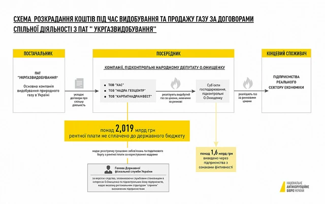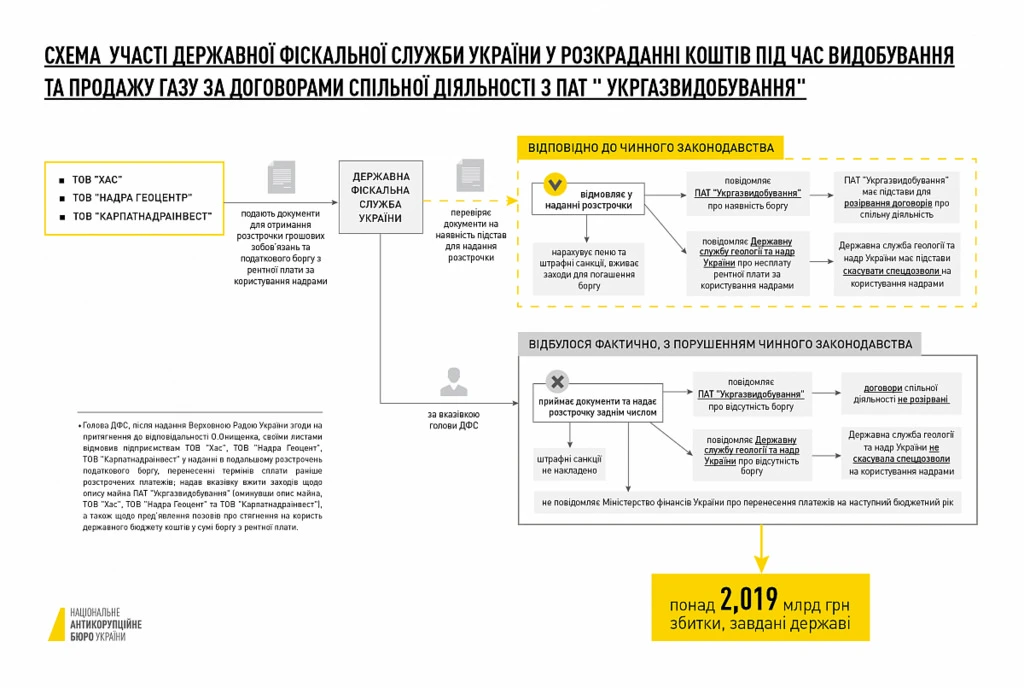 Зокрема, рішення про розстрочення сплати рентних платежів ухвалені "заднім" числом – без наявних на те обґрунтованих підстав та вже після настання встановлених дат сплати ренти згаданими компаніями. Розстрочення надавалися без погодження з Міністерством фінансів України, хоча їхній термін виходив за межі одного бюджетного року. Крім того, голова ДФС повідомив ПАТ "Укргазвидобування" та Державній службі геології та надр України недостовірну інформацію про відсутність у згаданих компаній податкового боргу. Цим він приховав факт невиконання операторами умов договорів про спільну діяльність в частині сплати до бюджету ренти за користування надрами, що могло б стати підставою для розірвання договорів між ПАТ “Укргазвидобування” та компаніями, задіяними у так званій "газовій схемі Онищенка".