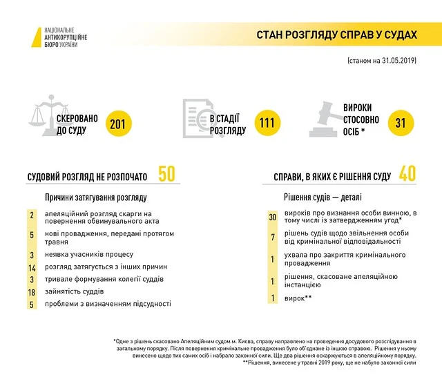 Детальна інформація про провадження, розслідувані детективами НАБУ й передані до суду, міститься на сайті Національного бюро у розділі «Справи у суді» та в інфографіці.
