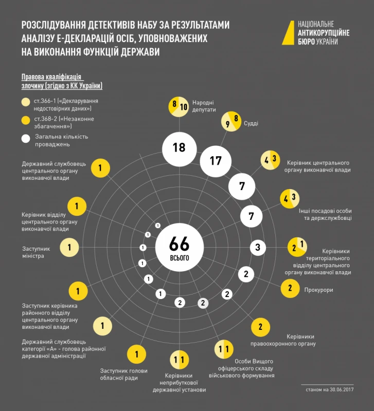 Станом на 30 червня 2017 року детективи НАБУ здійснюють розслідування у 66 кримінальних провадженнях, відкритих за результатами аналізу електронних декларацій осіб, уповноважених на виконання функцій держави або місцевого самоврядування.Нагадуємо, 19 липня детективи Національного антикорупційного бюро України під процесуальним керівництвом прокурорів Спеціалізованої антикорупційної прокуратури повідомили про підозру колишньому голові одного з міських судів Луганської області у вчиненні правопорушень, передбачених ст. 366-1 («Декларування недостовірної інформації») та ч.2 ст. 368-2 («Незаконне збагачення») Кримінального кодексу України.