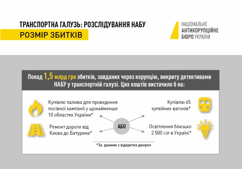Загальна сума завданих збитків через корупцію, викриту детективами НАБУ у транспортній галузі, перевищує 1,5 млрд грн. Задля їх відшкодування заарештовано майно та грошові кошти на суму понад 200 млн грн.