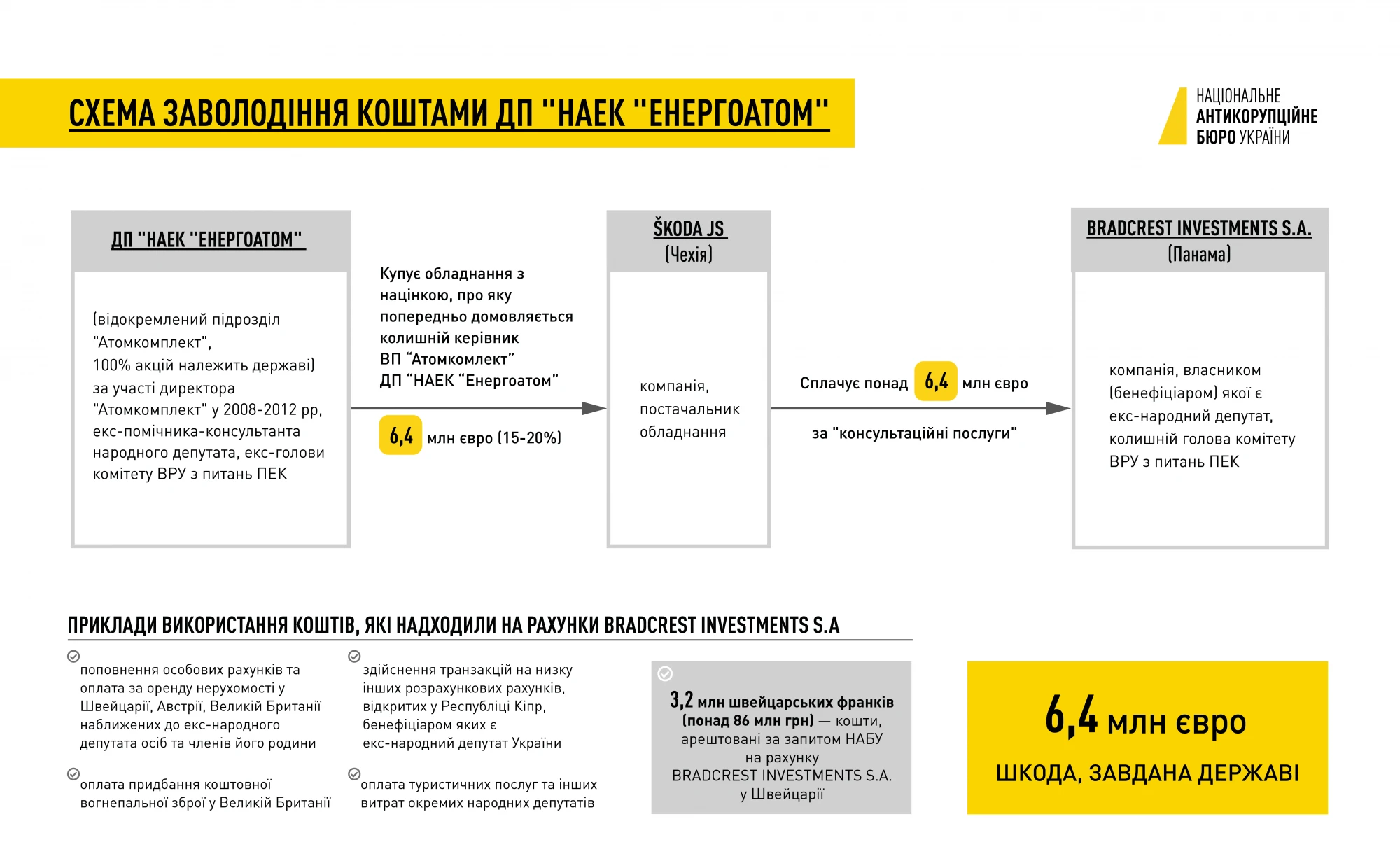 У подальшому, після отримання зазначених коштів за контрактами, укладеними з ДП «НАЕК «Енергоатом», «Škoda JS» перерахувала 6,4 млн євро на рахунок компанії «BRADCREST INVESTMENT S.A.» (Панамська Республіка), єдиним власником (бенефіціаром) якої є екс-народний депутат України.