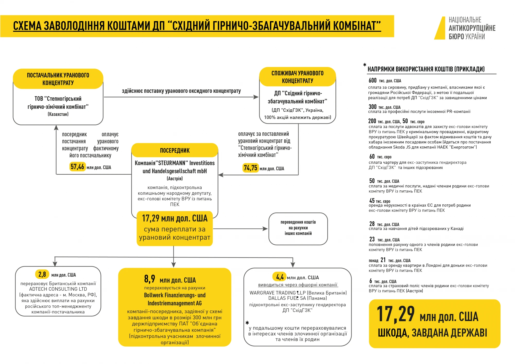 Державне підприємство «Східний гірничо-збагачувальний комбінат» уклало контракт на постачання уранового концентрату із компанією-посередником, підконтрольною, за даними слідства, колишньому народному депутату, екс-голові комітету Верховної Ради з питань паливно-енергетичного комплексу, ядерної політики та ядерної безпеки. Урановий концентрат поставлявся напряму від ТОВ «Степногірський гірничо-хімічний комбінат» (Казахстан), однак через компанію-посередника, внаслідок чого товар було поставлено за завищеною ціною, що призвело до завдання збитків державі у розмірі 17,28 млн дол. США.