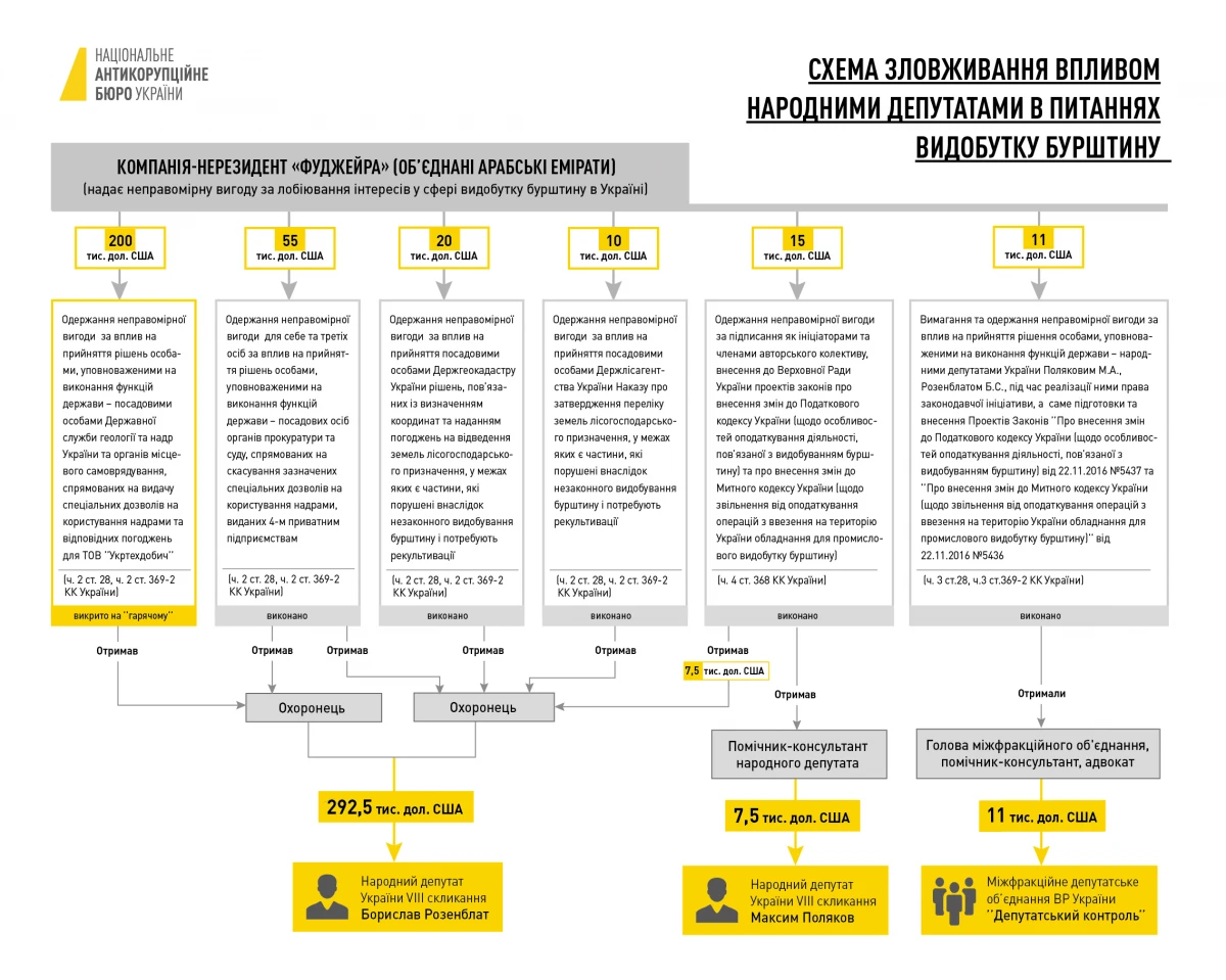 Cлідство встановило щонайменше п’ять епізодів злочинної діяльності, в результаті якої затримані особи, які, діючи в інтересах вказаних народних депутатів, отримали від представника іноземної компанії неправомірну вигоду на загальну суму понад 300 тис. дол. США. Ці кошти використано для підготовки законопроектів, незаконного впливу на посадових осіб Держгеокадастру, Держлісагентства, Держгеонадр України, органів місцевого самоврядування, суду та прокуратури з метою безперешкодного ухвалення рішень на користь зазначеної іноземної компанії.