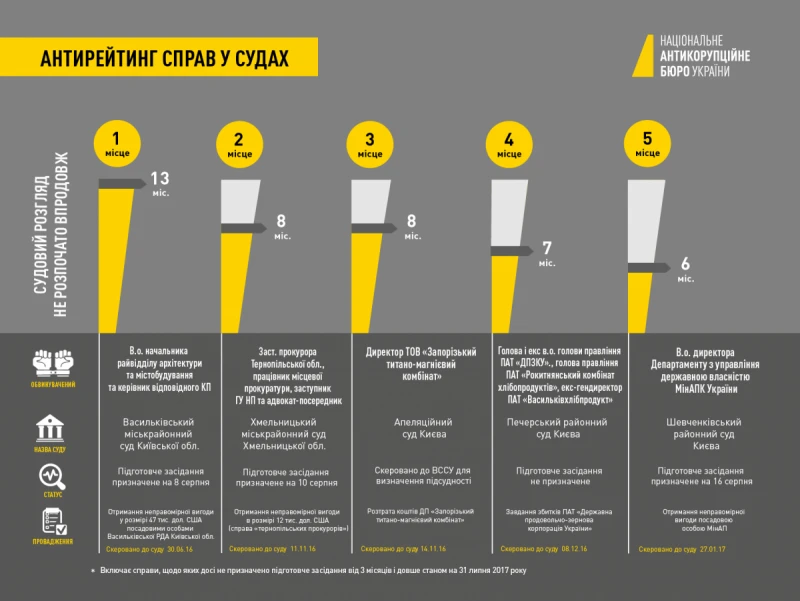 Справи НАБУ в судах: у 22 з понад 80 проваджень розгляд не розпочався (станом на 31.07.2017)