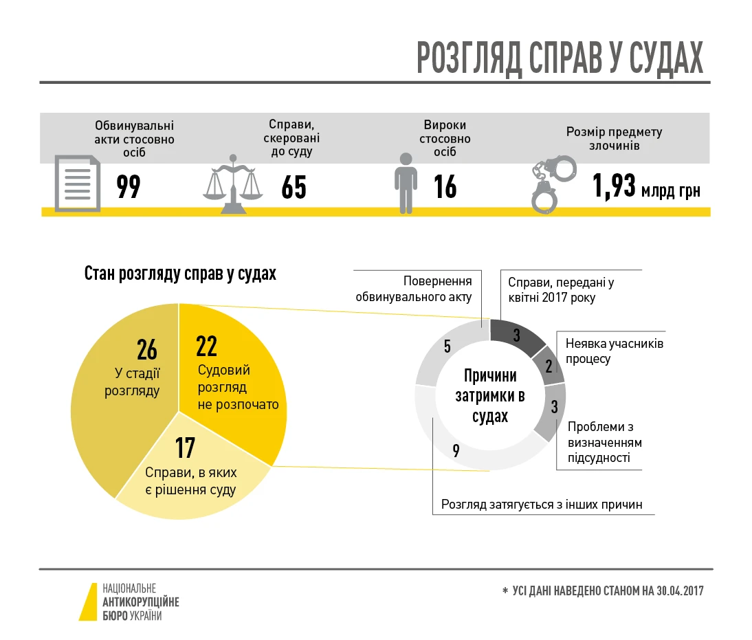 65 справ, розслідуваних детективами Національного антикорупційного бюро України, скерували до суду прокурори Спеціалізованої антикорупційної прокуратури станом на 30 квітня. Суди ухвалили рішення лише у 17 з них. 26 справ перебувають у стадії розгляду, а розгляд 22-х не розпочався.