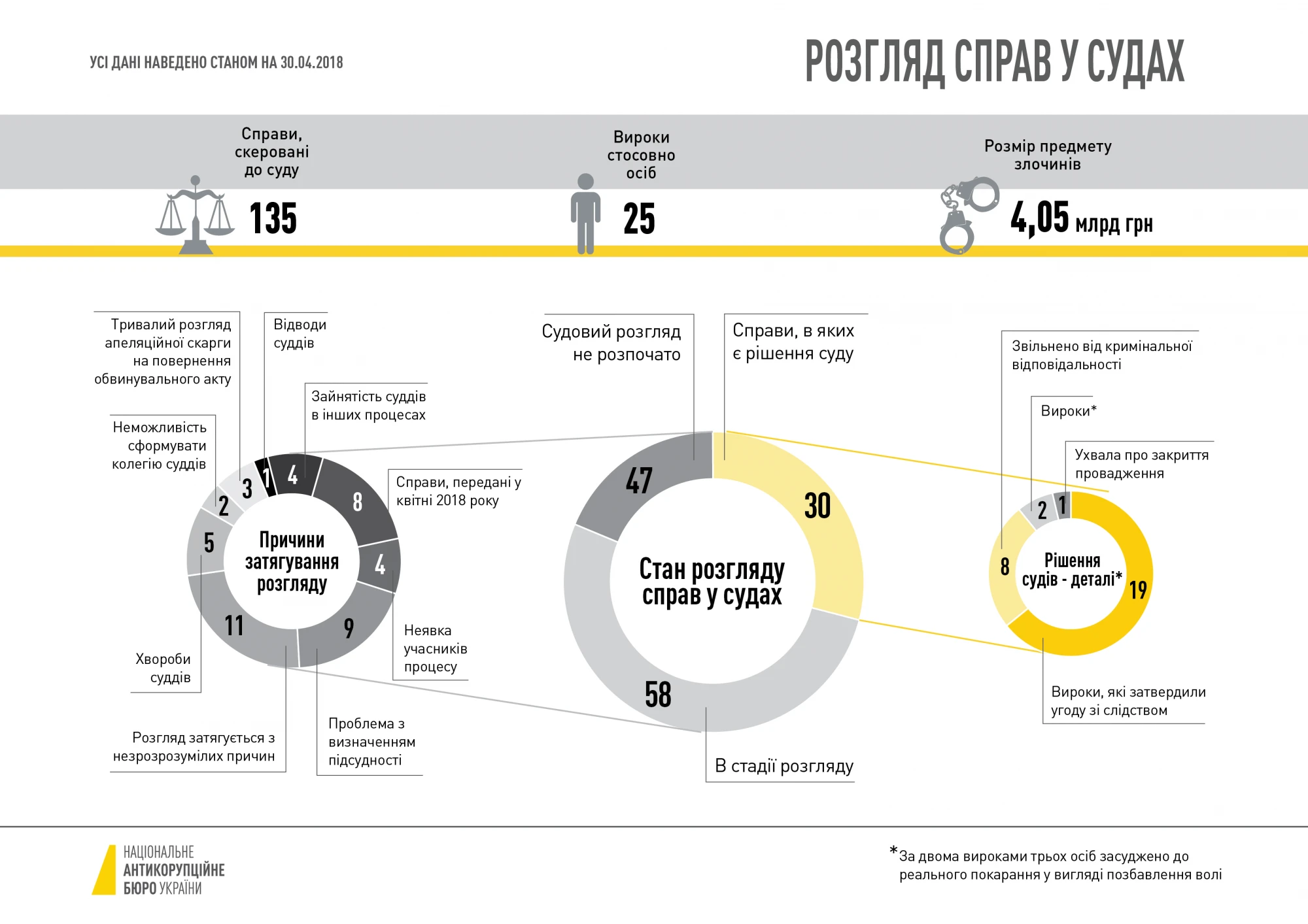 Більш детальна інформація про провадження, розслідувані детективами НАБУ й передані до суду, доступна в розділі сайту Національного бюро «Справи у суді» та в оновленій інфографіці.