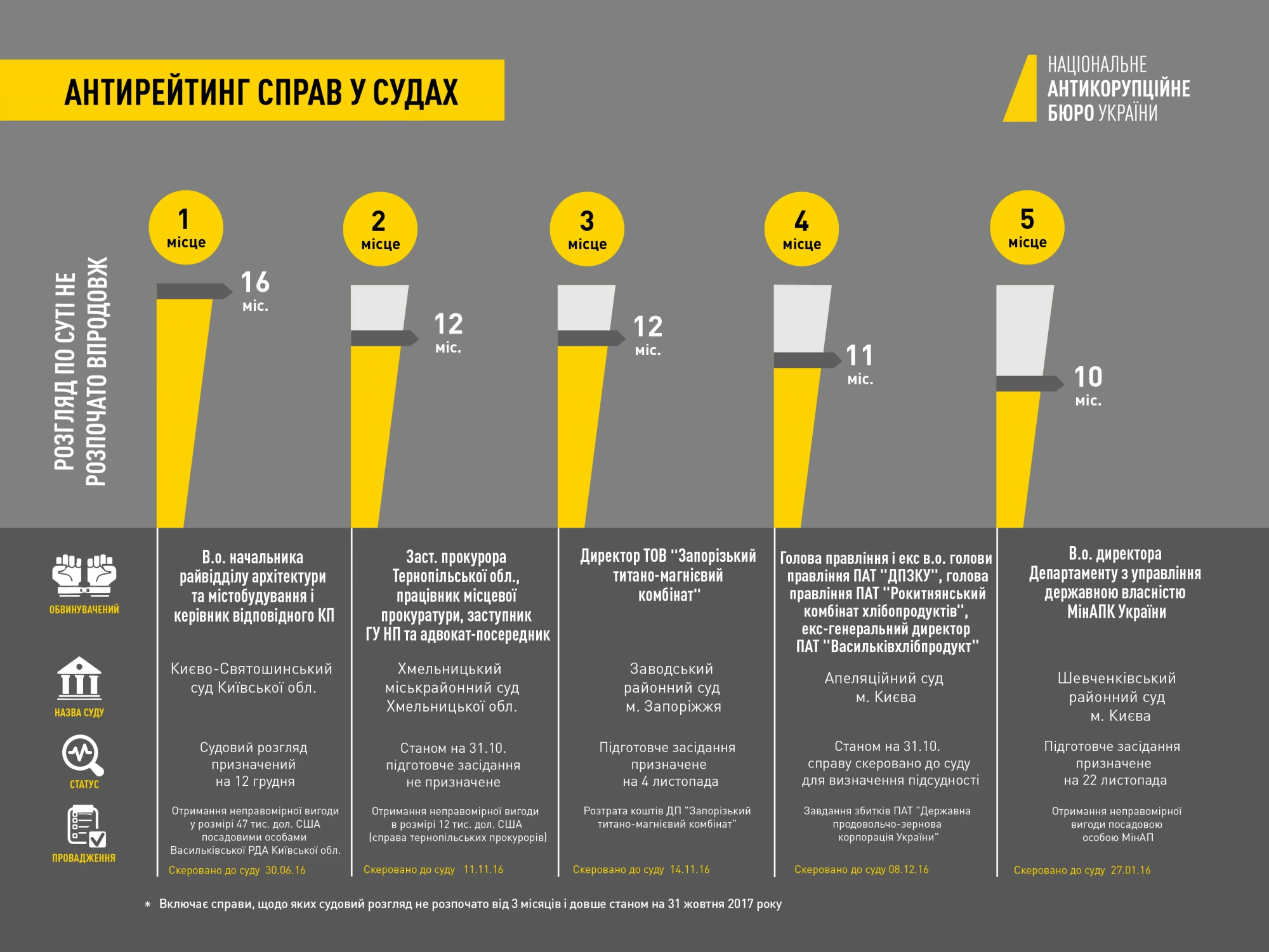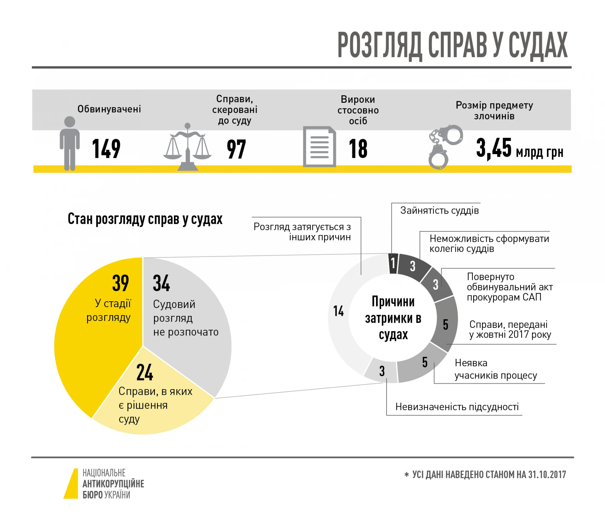 У 34 кримінальних провадженнях, в яких детективи Національного антикорупційного бюро України завершили досудове розслідування, а прокурори САП скерували обвинувальний акт до суду, судовий розгляд досі не розпочато. При цьому, деякі справи знаходяться поза увагою служителів Феміди понад 1,5 року. Зокрема, суд вже декілька місяців не може розпочати розгляд по суті провадження стосовно посадовців Васильківської РДА Київської області, при цьому засідання, які призначаються, з різних причин не відбуваються.Понад рік не розглядається й справа стосовно директора ТОВ «ЗТМК», який обвинувачується у зловживанні службовим становищем.