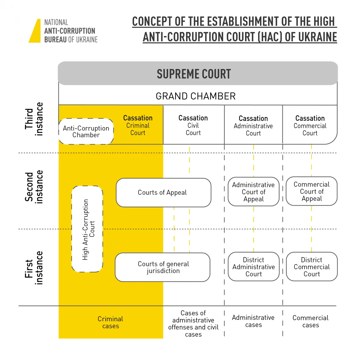 НАБУ повністю поділяє концепцію ВАС, погоджену представниками міжнародних організацій та громадського сектору 16 червня в рамках тематичного круглого столу ОБСЄ. Її суть полягає у двох речах. Перша — це прозорий та неупереджений добір суддів, який би гарантував найвищий рівень суспільної довіри до цього інституту. Переконані, до конкурсів на посади у ВАС важливо залучити не лише суддів, а й адвокатів, правників та науковців — порядних людей з високим рівнем кваліфікації, адже корупційні схеми, які розслідують НАБУ і САП доволі складні та заплутані. Сама ж конкурсна процедура має відбуватися прозоро, із залученням до конкурсної комісії міжнародних експертів та громадськості. Другий важливий момент стосується інстанційності антикорупційного суду — будь-яка особа, справу якої розглядає ВАС як суд першої інстанції повинна мати конституційно гарантоване право на перегляд ухваленого ним рішення в апеляційному порядку та у передбачених законом випадках — у касаційному порядку. На нашу думку, прийнятними можуть бути різні варіанти інституційного рішення щодо апеляційної інстанції — створення апеляційної палати у ВАС або в структурі Касаційного кримінального суду Верховного Суду, за умови, що буде забезпечено прозорий добір професійних та доброчесних суддів до такої палати та її адміністративну автономію в межах суду. Наголошуємо: ця концепція жодним чином не суперечить Конституції України та вимогам Закону «Про Судоустрій в статус суддів». Навпаки оновлений Закон «Про судоустрій і статус суддів» передбачає можливість діяльності Вищого антикорупційного суду, як невід’ємної складової нинішньої системи судоустрою України.