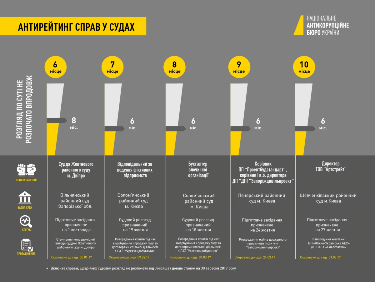 У 30 провадженнях, в яких детективи Національного антикорупційного бюро України завершили досудове розслідування, а прокурори САП скерували обвинувальний акт до суду, судовий розгляд досі не розпочато. 80% цих проваджень перебувають у суді понад місяць. Майже кожна друга із цих справ перебуває поза увагою служителів Феміди від шести місяців і більше.