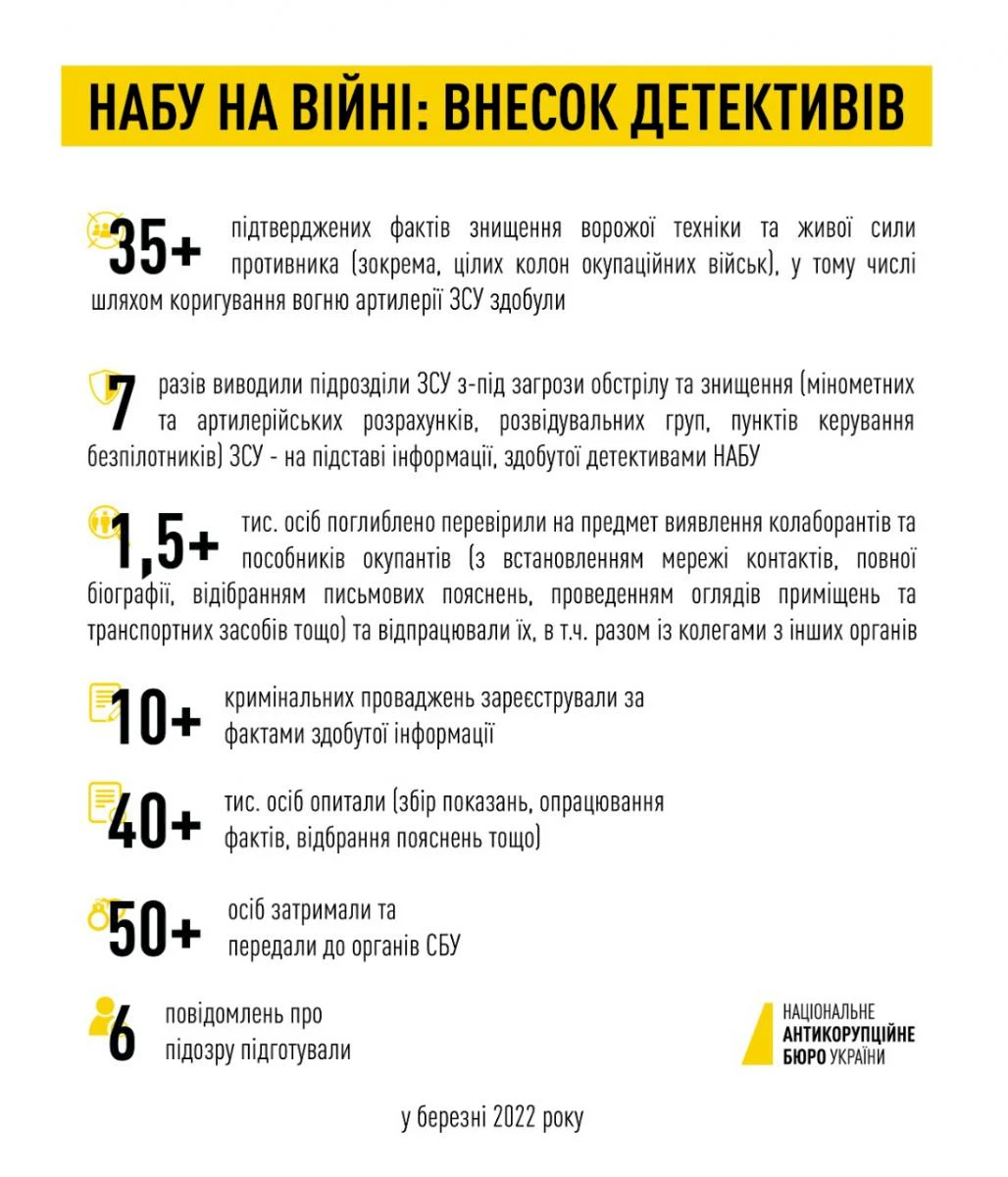 Не припинялися і слідчо-розшукові дії. Впродовж місяця детективи НАБУ опитали понад 40 тис. осіб. З них більш ніж 1,5 тис. поглиблено перевірили на предмет колаборації та пособництва ворогу з встановленням мережі контактів, повної біографії, відібранням письмових пояснень, проведенням оглядів приміщень та транспортних засобів.