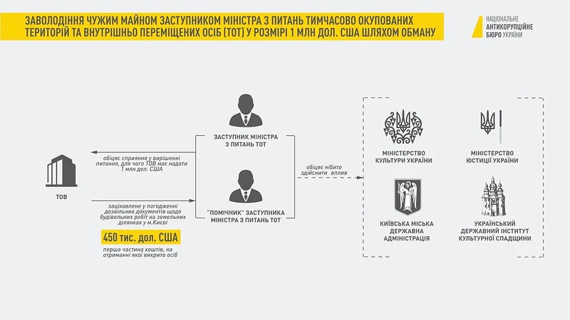 Дізнавшись про це, заступник міністра запропонував свої «послуги» із забезпечення погодження проектної документації за грошову винагороду у розмірі 1 млн дол. США. Як запевнив експосадовець, ця сума начебто мала бути розподілена між керівниками та службовими особами виконавчих органів влади, серед яких: Міністерство культури України, Міністерство юстиції України, Український державний інститут культурної спадщини, Київська міська державна адміністрація та інші.