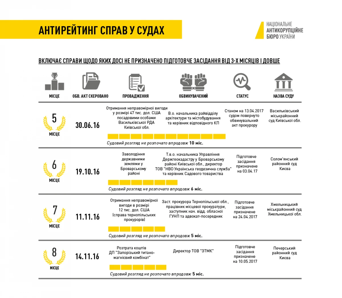Всі рекорди б’є справа про отримання неправомірної вигоди суддею Сєвєродонецького міського суду (відома як суддя з нерухомістю в Іспанії) – судовий розгляд не розпочато впродовж 14 місяців. 12 місяців у суді безрезультатно знаходиться справа про незаконний вплив на міністра економічного розвитку та торгівлі, впродовж 11 місяців — справа про отримання неправомірної вигоди начальницею відділу прокуратури Кіровоградської області.