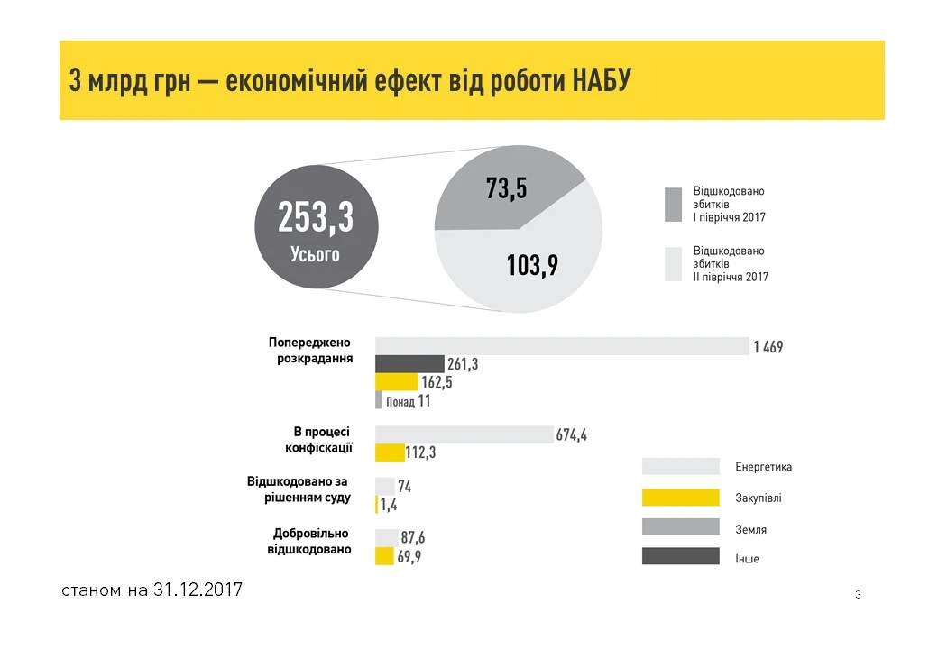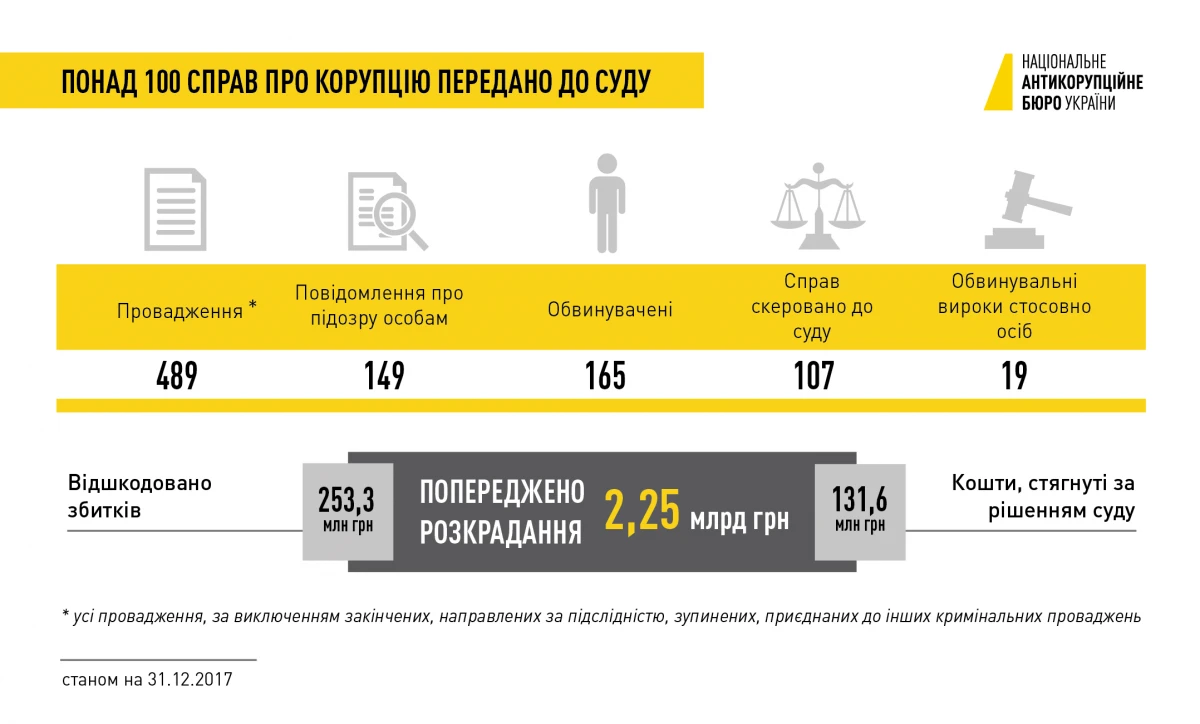 Завдяки роботі детективів НАБУ та прокурорів САП державі вже повернуто понад 250 млн грн. Із цієї суми 174 млн грн відшкодовано у 2017 році. Крім того, правоохоронним органам вдалося попередити розкрадання майже двох млрд грн. Для усунення передумов вчинення корупційних злочинів юристи Національного бюро подали 35 позовів до суду про визнання недійсними кабальних для держави угод на загальну суму понад 6 млрд грн. Внаслідок цього понад 130 млн грн вже стягнуто на користь держави.