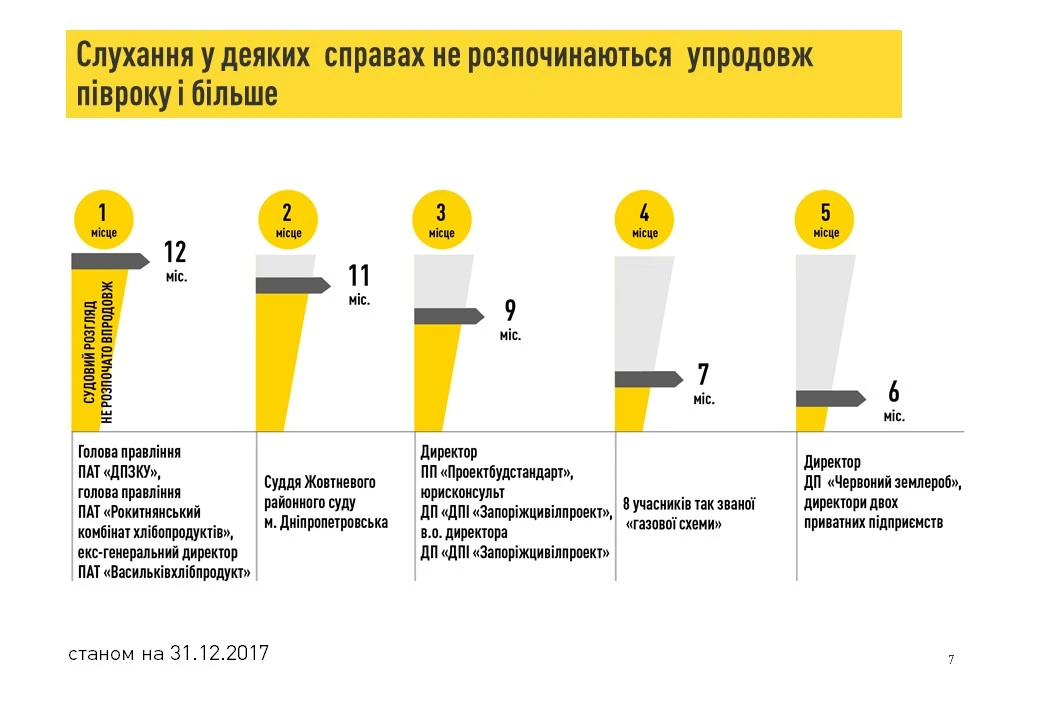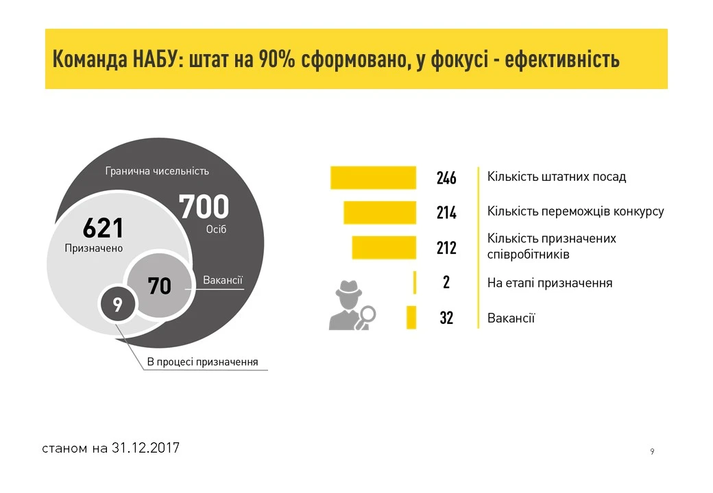 Він підкреслив, що у минулому році зокрема було завершено досудові розслідування щодо таких високопосадовців як голова Рахункової палати, колишній керівник Державної фіскальної служби України, екс-голова комітету Верховної Ради України з питань паливно-енергетичного комплексу. Крім того, до суду скеровано справи стосовно низки керівників великих державних компаній, що роками потерпали від корупційних схем.