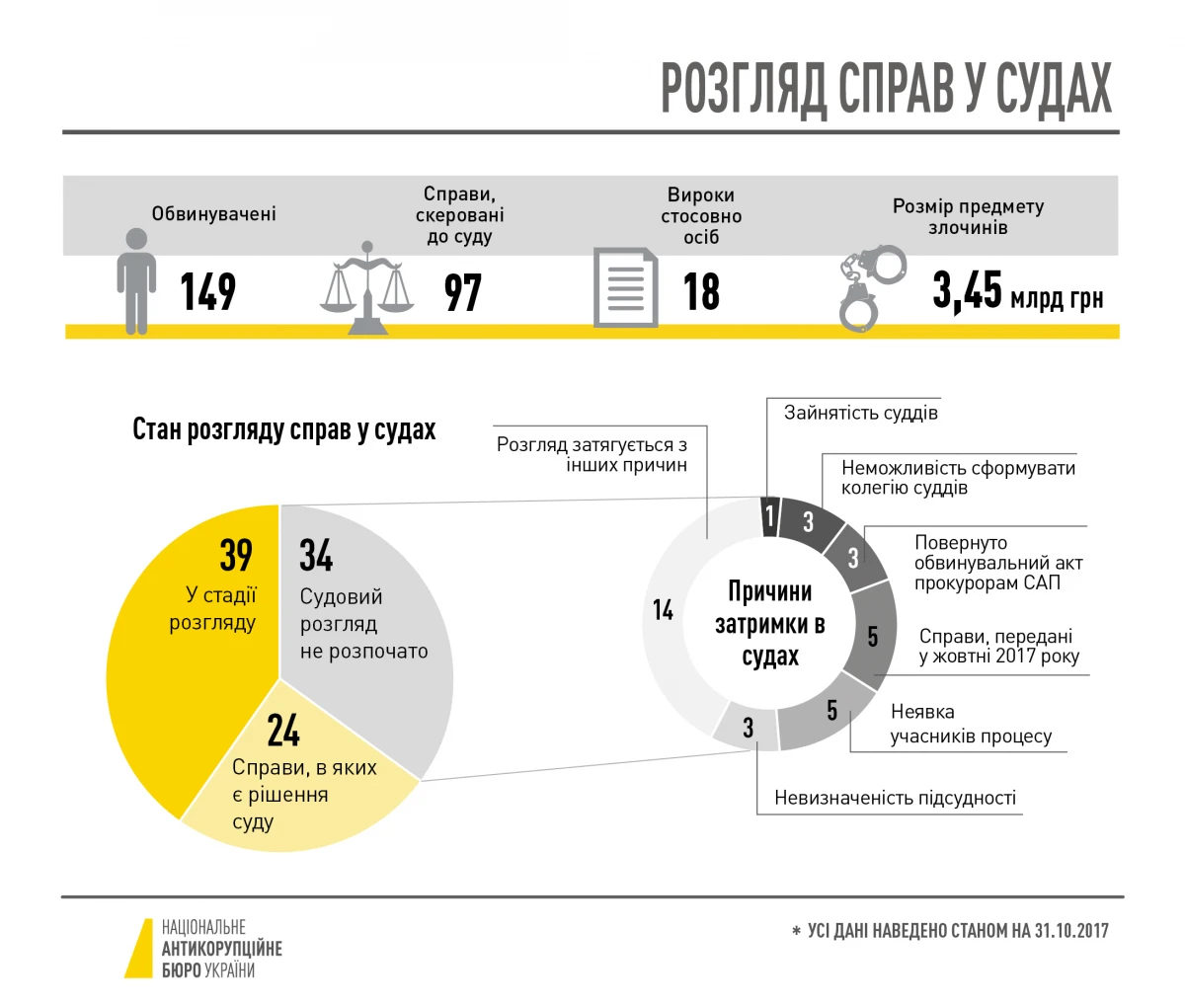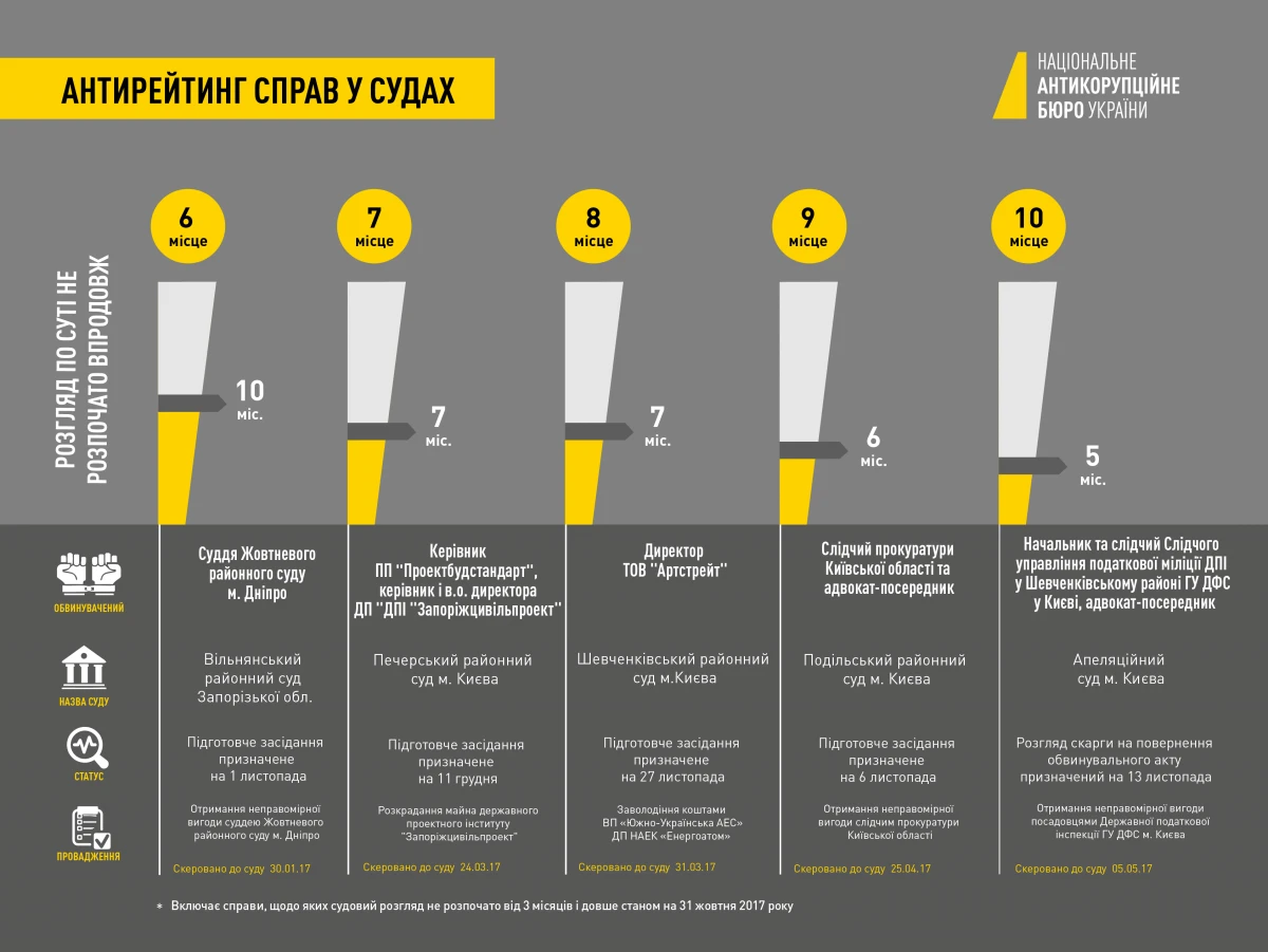 У 34 кримінальних провадженнях, в яких детективи Національного антикорупційного бюро України завершили досудове розслідування, а прокурори САП скерували обвинувальний акт до суду, судовий розгляд досі не розпочато. При цьому, деякі справи знаходяться поза увагою служителів Феміди понад 1,5 року. Зокрема, суд вже декілька місяців не може розпочати розгляд по суті провадження стосовно посадовців Васильківської РДА Київської області, при цьому засідання, які призначаються, з різних причин не відбуваються.Понад рік не розглядається й справа стосовно директора ТОВ «ЗТМК», який обвинувачується у зловживанні службовим становищем.