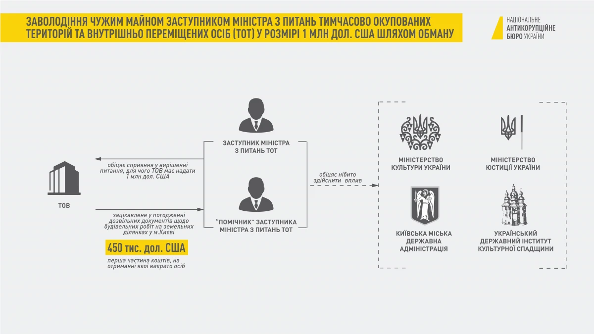 14 серпня 2019 року викрито та затримано «на гарячому» заступника міністра з питань тимчасово окупованих територій та внутрішньо переміщених осіб України (далі – ТОТ), а також його «помічника». За даними слідства, ці особи шляхом обману заволоділи чужим майном — грошовими коштами — в особливо великому розмірі.