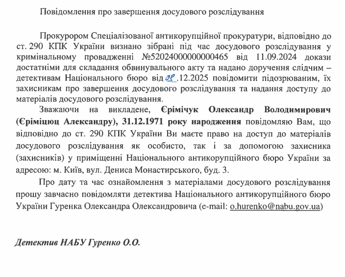 Повідомляємо Єрімічука Олександра Володимировича та його захисників про відкриття та надання доступу до матеріалів досудового розслідування у кримінальному провадженні №52024000000000465 від 11.09.2024.