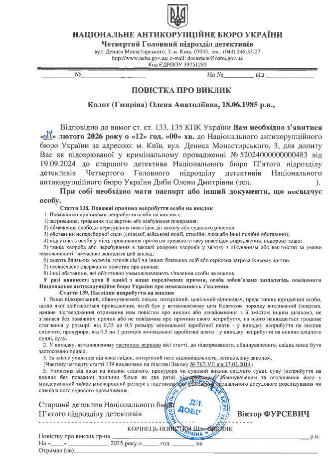 Згідно з вимогами ст. 133, 135 КПК України Ви, Колот (Гмиріна) Олена Анатоліївна, викликаєтеся 24 лютого 2026 року о 12.00 до старшого детектива Національного бюро П'ятого підрозділу детективів Четвертого Головного підрозділу детективів Диби Олени Дмитрівни за адресою: м. Київ, вул. Дениса Монастирського, 3, для допиту Вас як підозрюваної у кримінальному провадженні № 52024000000000483 від 19.09.2024.