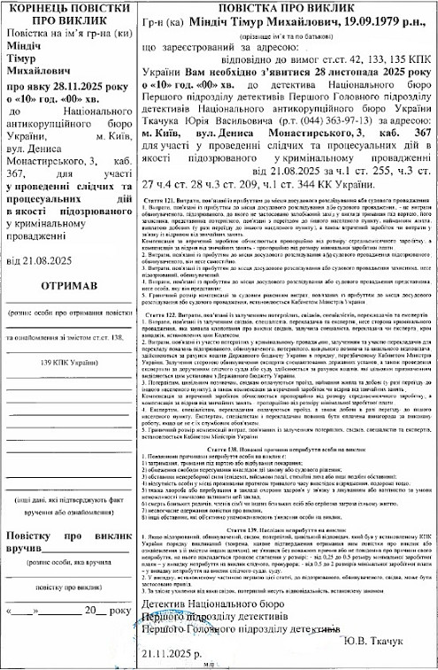 Згідно з вимогами ст.ст. 133, 135 та 137 КПК України Ви, Міндіч Тімур Михайлович, викликаєтесь 28.11.2025 року о 10.00 год. до детектива Національного бюро Першого підрозділу детективів Першого Головного підрозділу детективів Національного антикорупційного бюро України Ткачука Юрія Васильовича за адресою: м. Київ, вул. Дениса Монастирського, 3, для проведення відносно Вас та за Вашою участю у статусі підозрюваного процесуальних дій у кримінальному проваджені № 52025000000000472 від 21.08.2025, а саме: вручення процесуальних документів та проведення інших процесуальних дій.