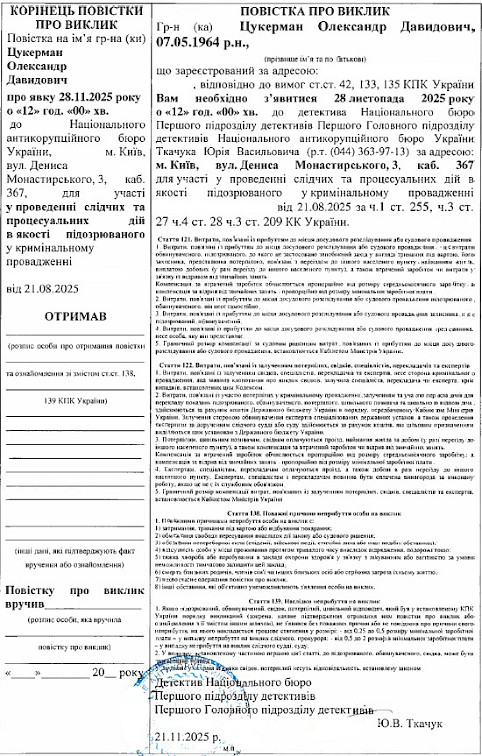 Згідно з вимогами ст.ст. 133, 135 та 137 КПК України Ви, Цукерман Олександр Давидович, викликаєтесь 28.11.2025 року о 12.00 год. до детектива Національного бюро Першого підрозділу детективів Першого Головного підрозділу детективів Національного антикорупційного бюро України Ткачука Юрія Васильовича за адресою: м. Київ, вул. Дениса Монастирського, 3, для проведення відносно Вас та за Вашою участю у статусі підозрюваного процесуальних дій у кримінальному проваджені № 52025000000000472 від 21.08.2025, а саме: вручення процесуальних документів та проведення інших процесуальних дій.