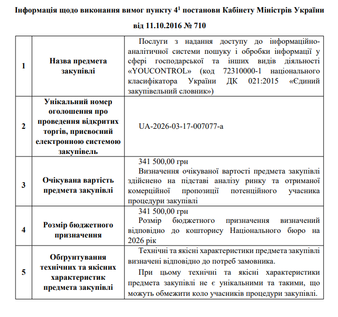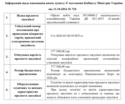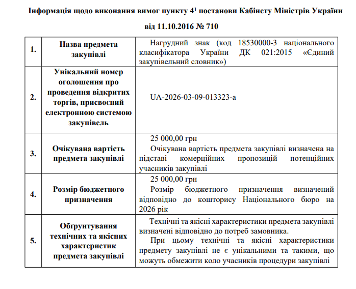 Інформація щодо виконання вимог пункту 4-1 постанови Кабінету Міністрів України від 11.10.2016 N 710, закупівля UA-2026-03-04-014933-a
