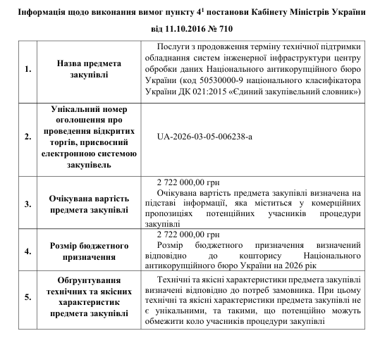 Інформація щодо виконання вимог пункту 4-1 постанови Кабінету Міністрів України від 11.10.2016 N 710, закупівля UA-2026-03-05-006238-a