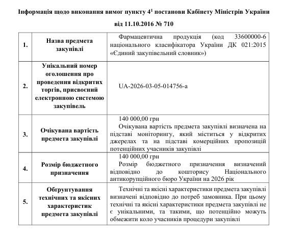 Інформація щодо виконання вимог пункту 4-1 постанови Кабінету Міністрів України від 11.10.2016 N 710, закупівля UA-2026-03-05-014756-a