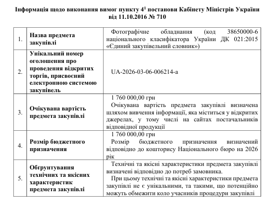 Інформація щодо виконання вимог пункту 4-1 постанови Кабінету Міністрів України від 11.10.2016 N 710, закупівля UA-2026-03-06-006214-a