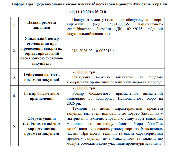 Інформація щодо виконання вимог пункту 4-1 постанови Кабінету Міністрів України від 11.10.2016 N 710, закупівля UA-2026-03-10-003218-a