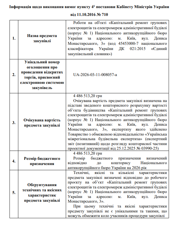 Інформація щодо виконання вимог пункту 4-1 постанови Кабінету Міністрів України від 11.10.2016 N 710, закупівля UA-2026-03-11-008057-a