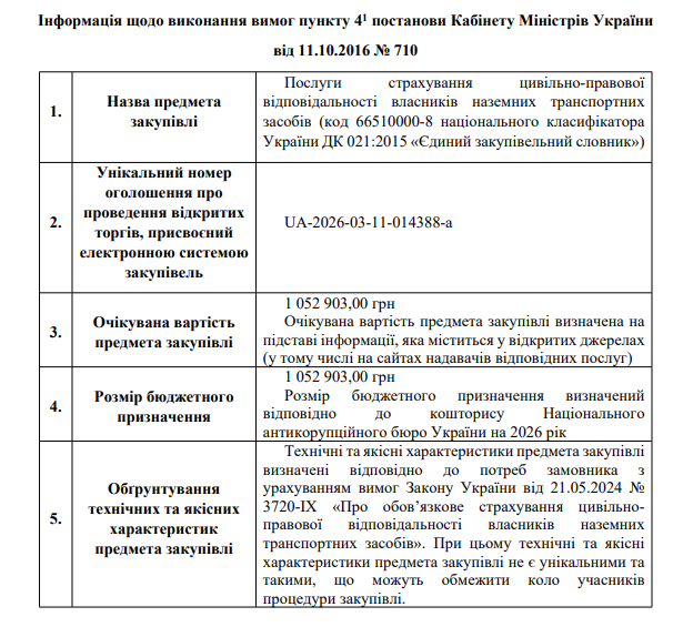 Інформація щодо виконання вимог пункту 4-1 постанови Кабінету Міністрів України від 11.10.2016 N 710, закупівля UA-2026-03-11-014388-a