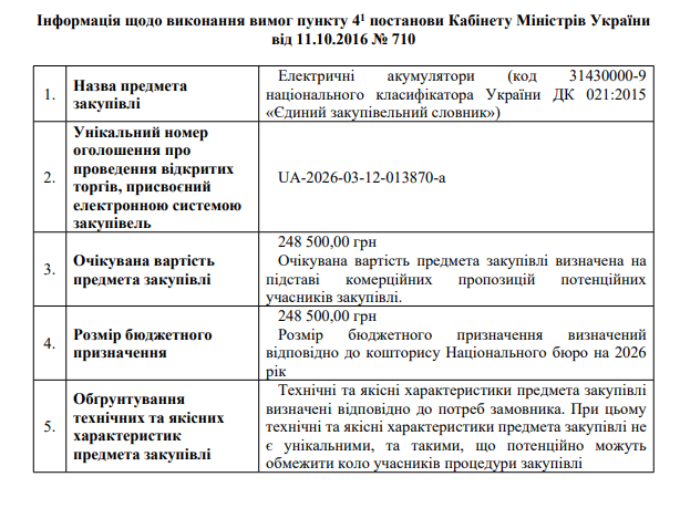 Інформація щодо виконання вимог пункту 4-1 постанови Кабінету Міністрів України від 11.10.2016 N 710, закупівля UA-2026-03-12-013870-a