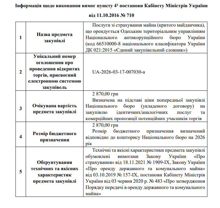 Інформація щодо виконання вимог пункту 4-1 постанови Кабінету Міністрів України від 11.10.2016 N 710, закупівля UA-2026-03-17-007030-a