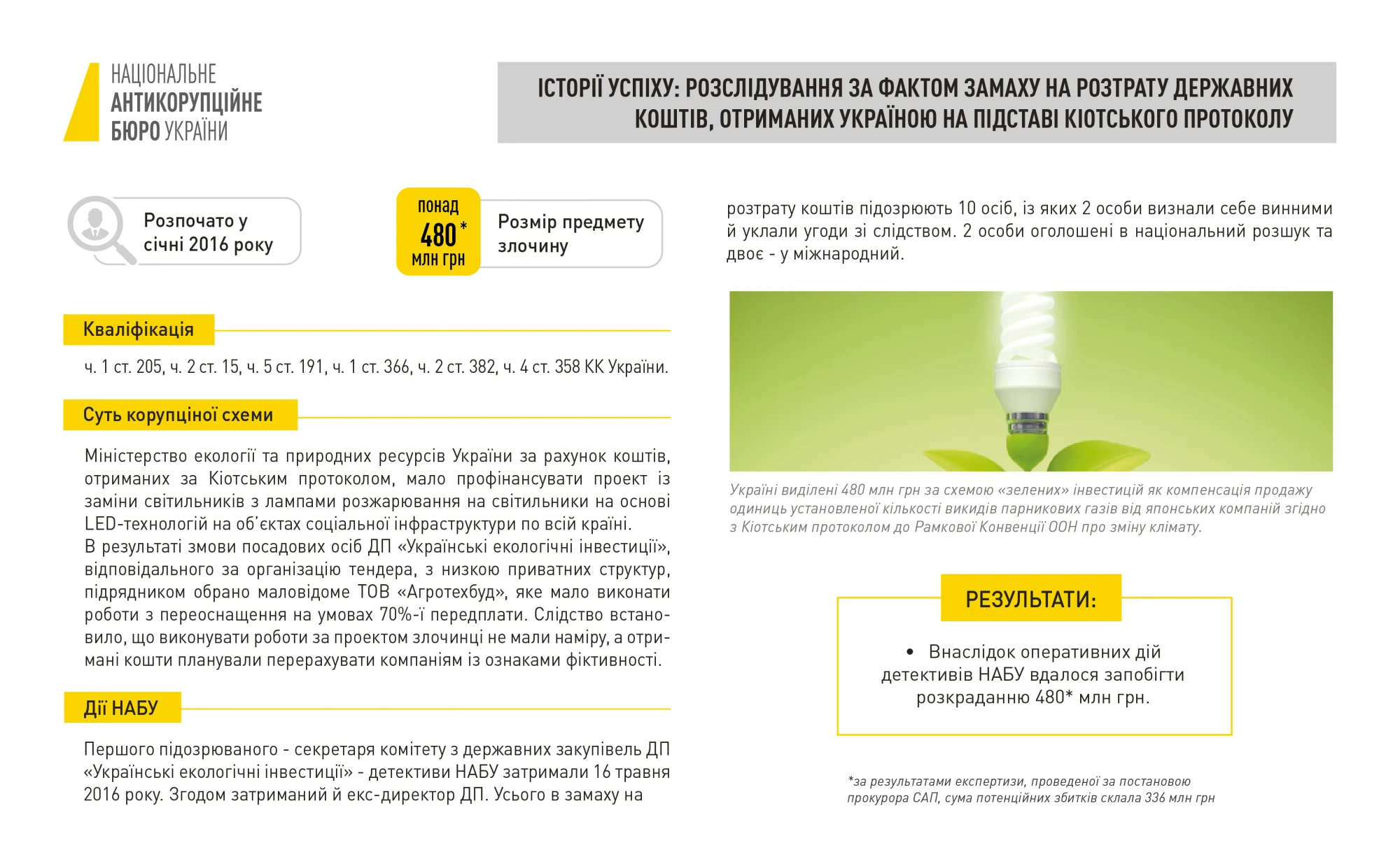 У січні 2016 року детективи НАБУ розпочали розслідування у кримінальному провадженні за фактом замаху на заволодіння державними коштами у розмірі 480 млн грн, отриманими Україною на підставі Кіотського протоколу. Першого підозрюваного було затримано 16 травня. Усього в замаху підозрюються 10 осіб, із яких 2 особи визнали себе винними й уклали угоди зі слідством. 2 осіб оголошено в національний розшук та двох – у міжнародний.