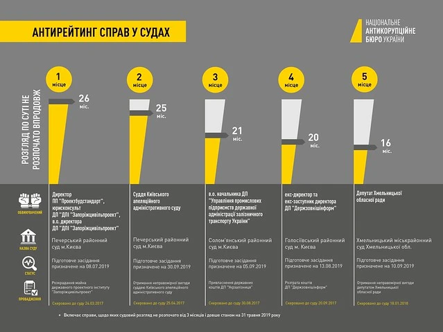 У чверті з понад 200 справ, в яких детективи Національного бюро завершили досудове розслідування, а прокурори САП скерували до судових інстанцій обвинувальні акти або клопотання про звільнення від кримінальної відповідальності, не відбулося навіть підготовче засідання.Деякі з цих справ перебувають без руху у судових інстанціях понад два роки. Так, наприклад обвинувальний акт стосовно судді Київського апеляційного адміністративного суду був скерований до суду ще у квітні 2017 року. До сьогодні не було проведено навіть підготовче засідання.