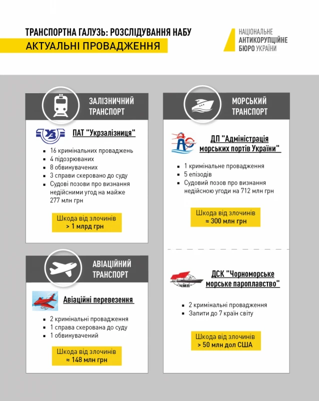 Загалом, детективи НАБУ під процесуальним керівництвом прокурорів Спеціалізованої антикорупційної прокуратури розслідують корупційні злочини у транспортній галузі в рамках понад 20 кримінальних проваджень. Досудове розслідування у чотирьох із них завершене. Обвинувальні акти стосовно дев’яти осіб скеровано до суду.