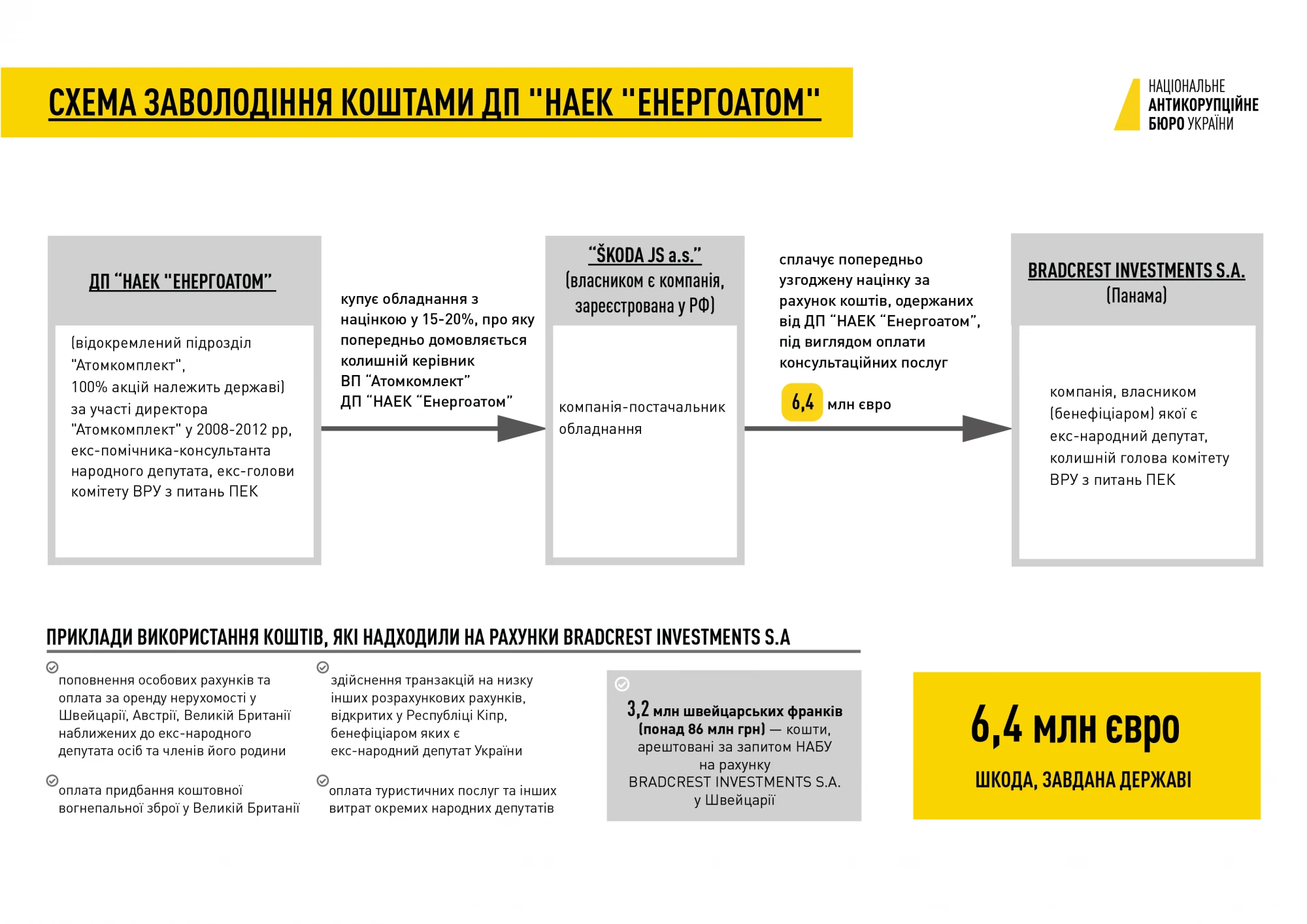 Після отримання зазначених коштів за контрактами, укладеними з ДП «НАЕК «Енергоатом», «Škoda JS» під виглядом оплати консультаційних послуг перевела кошти на рахунки панамської компанії «BRADCREST INVESTMENT S.A.», власником якої є екс-народний депутат України, колишній голова комітету з питань ПЕК.