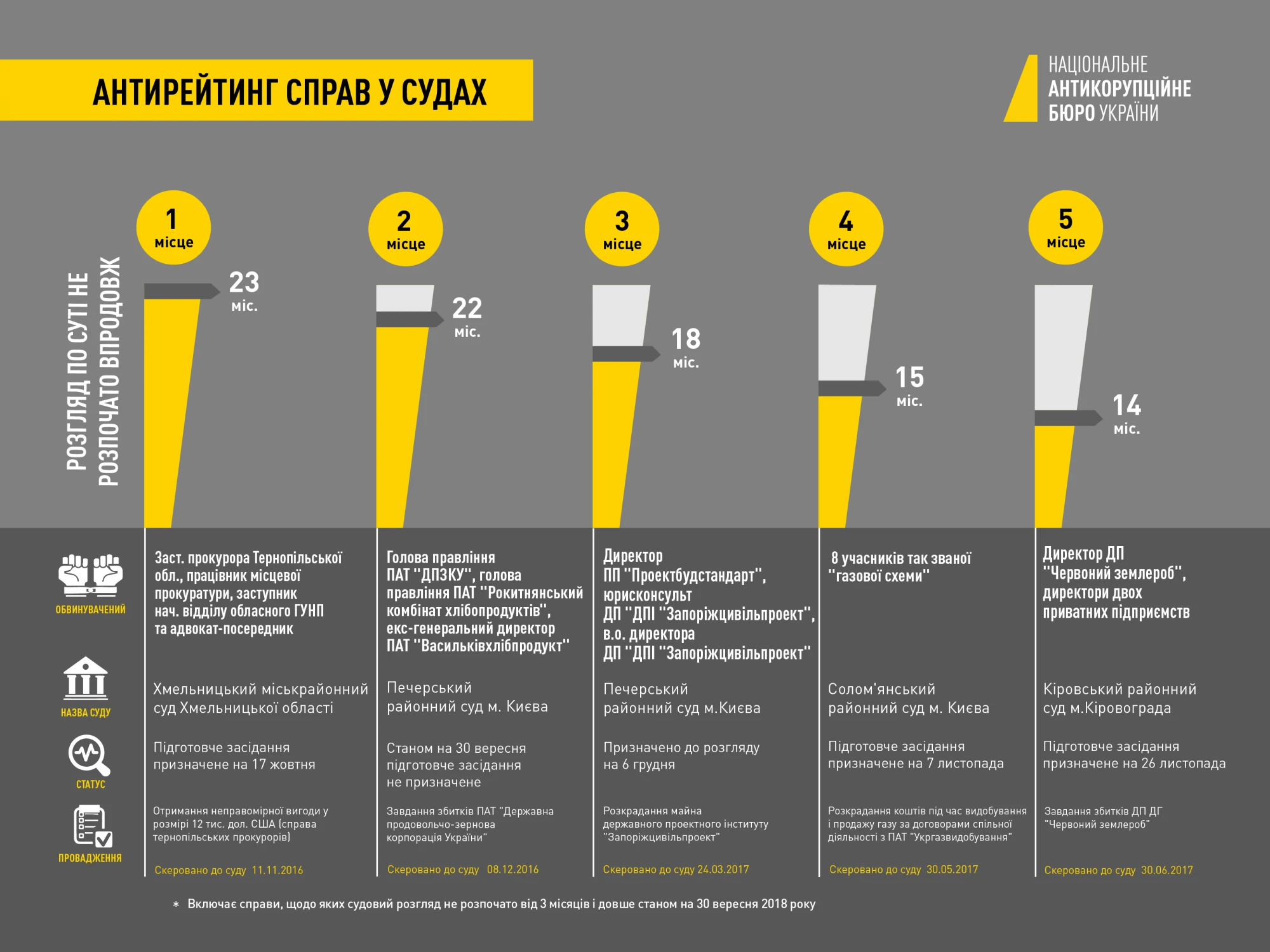 На жаль, в очікуванні результатів деякі провадження від НАБУ і САП припадають пилом майже два роки. Так, наприклад, так звана «справа тернопільських прокурорів» за обвинуваченням посадовців в отриманні неправомірної вигоди вже 22 місяці перебуває у судових інстанціях, а її розгляд по суті досі не розпочато. Схожа ситуація з провадженням за фактом завдання збитків «Державній продовольчо-зерновій корпорації України». Засідання не може відбутися з грудня 2016 року.