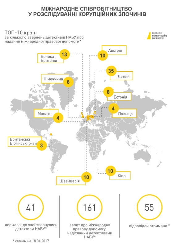 Іноземні банки та компанії причетні до завдання більш як третини усіх збитків від злочинів, які розслідує Національне антикорупційне бюро України. Наразі детективи НАБУ встановили комерційні структури зі щонайменше 10 країн світу, за участі яких із України було виведено понад 2,27 млрд грн, 428 млн дол. США, 4,3 млн євро та 825 тис. фунтів стерлінгів.