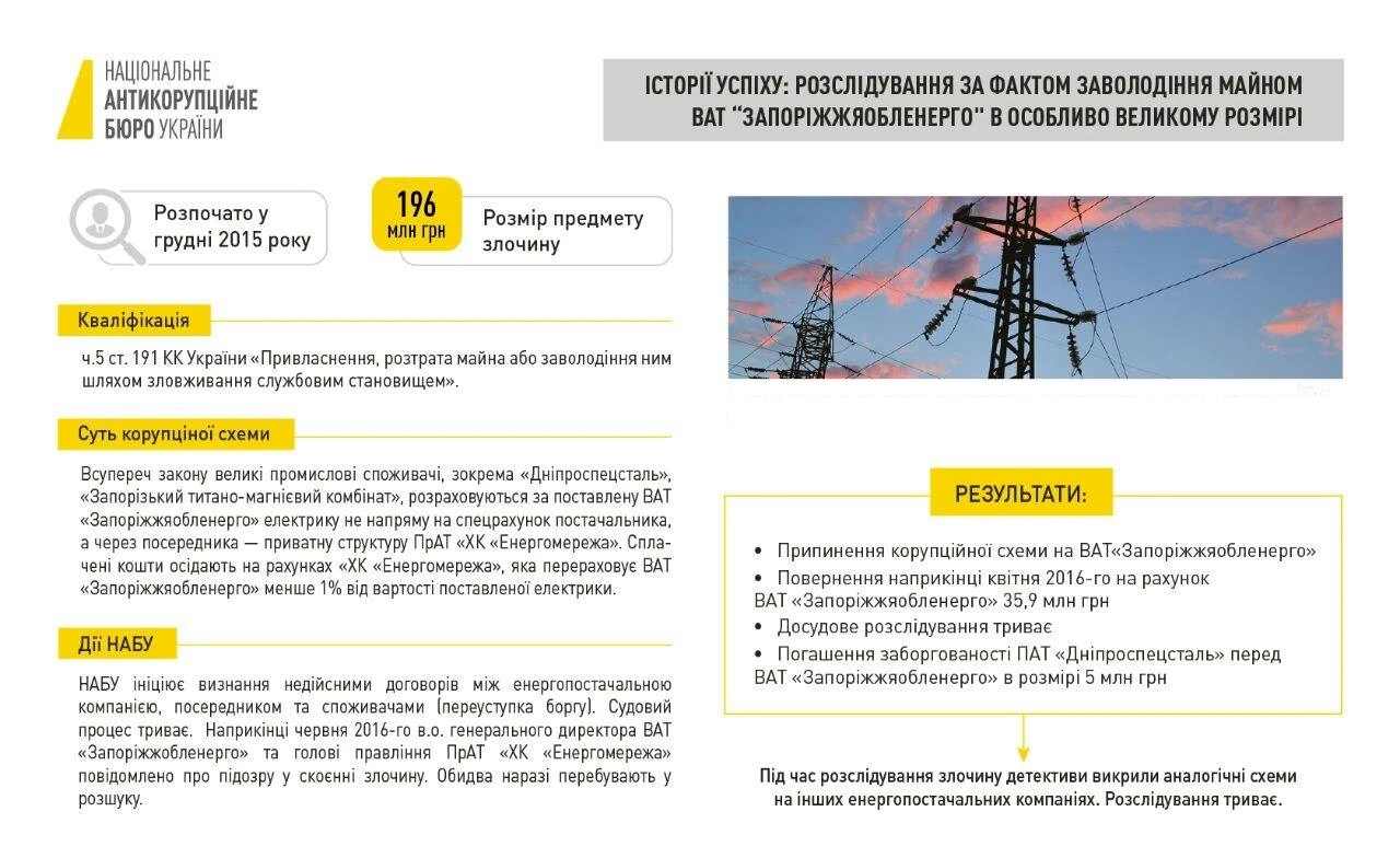 4 грудня 2015 року детективи НАБУ розпочали розслідування кримінального провадження за фактом привласнення майна ВАТ «Запоріжжяобленерго» (понад 60% акцій належить державі) в особливо великих розмірах – 196 млн грн. Наприкінці січня – початку лютого 2016 року НАБУ подало до суду 4 позовні заяви про визнання недійсними договорів уступки права вимоги між ВАТ «Запоріжжяобленерго» та приватною структурою «Енергомережа». Станом на квітень 2016 року всі позови були задоволені. Корупційну схему припинено. Досудове розслідування триває.