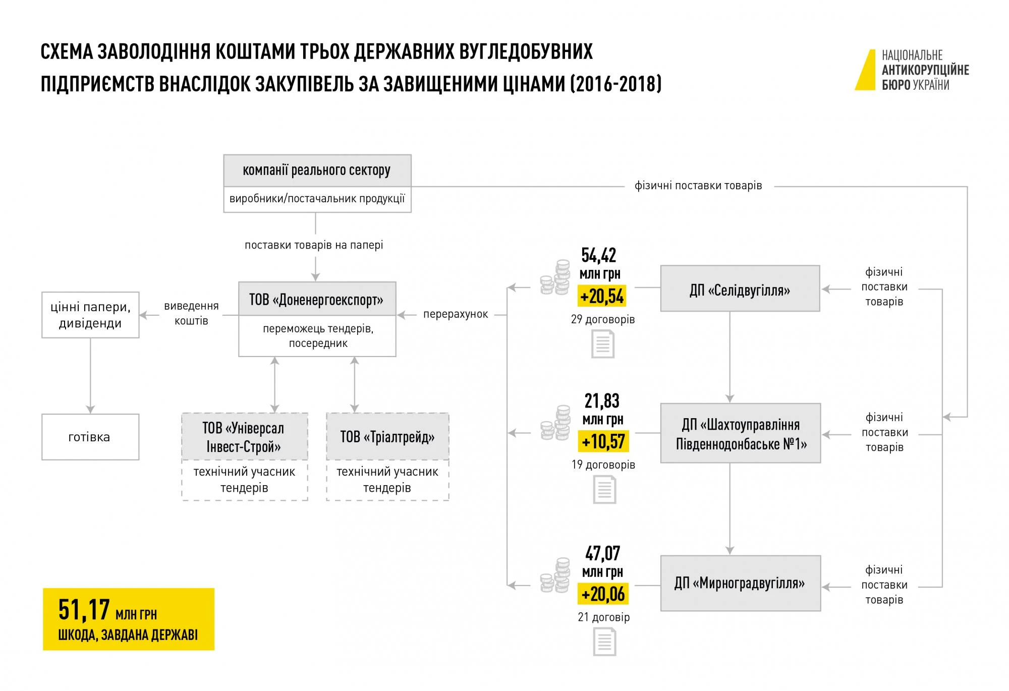 У 69 закупівлях зазначених вугледобувних підприємств, які досліджували НАБУ та САП і в яких встановили факти порушення законодавства, договори на постачання отримувала одна компанія. При цьому йшлося про постачання найрізноманітніших позицій: паливно-мастильні матеріали, запасні частини до гірничо-шахтного обладнання, металовироби, кабельна продукція для шахт. Однак, фактично ця компанія виконувала роль посередника, перепродуючи з націнкою товар, придбаний в учасників реального сектору. Ті, в свою чергу через навмисно створені учасниками схеми перешкоди не мали реальних шансів напряму співпрацювати з держпідприємствами.