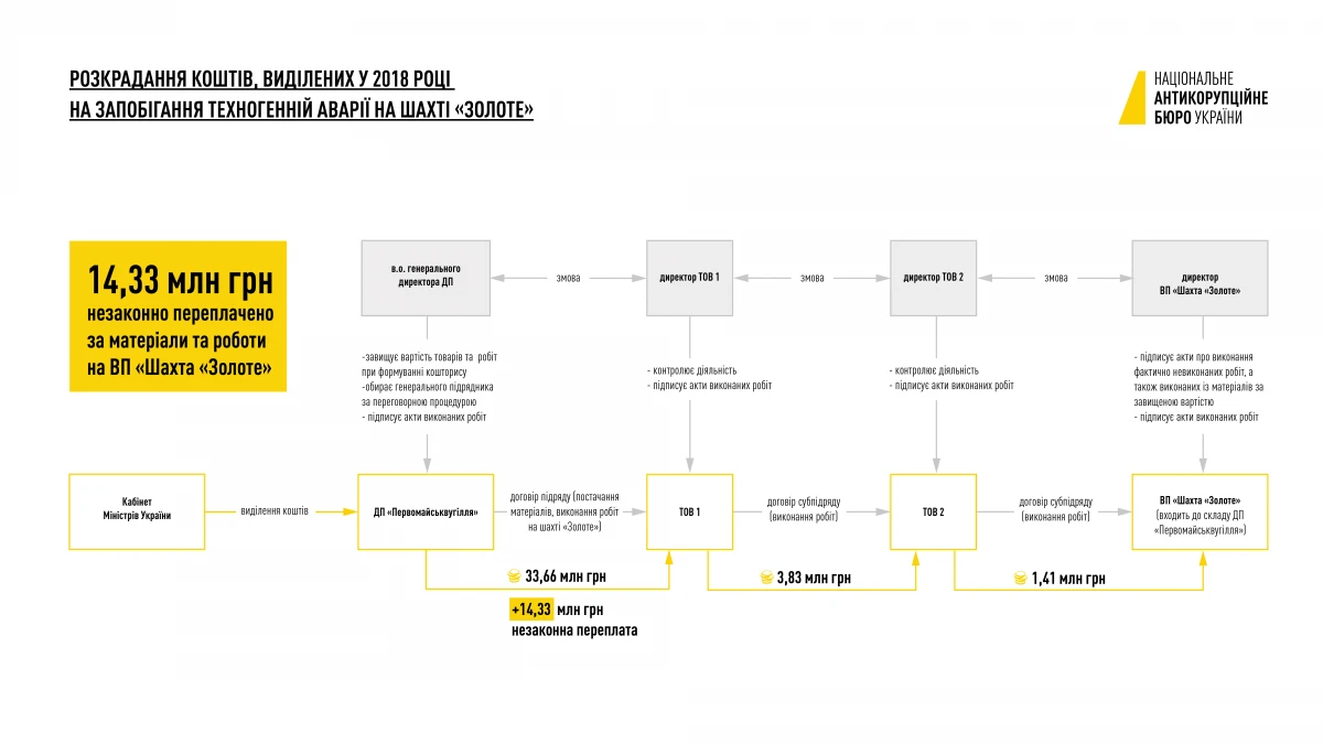 On October 19, 2020, the Detectives of the National Anti-Corruption Bureau of Ukraine (NABU) under the procedural guidance of the Prosecutors of the Specialized Anti-Corruption Prosecutor`s Office (SAPO) jointly with the Department of Strategic Investigations of the National Police of Ukraine exposed corrupt scheme of embezzlement UAH 14.33 million. These funds were allocated on preventing technological accident at the coal mines located in Luhansk Oblast. The actions of the suspects are qualified under Part 5 Article 191, Part 2 Article 15, Part 5 Article 191, and Part 1 Article 366 of the Criminal Code of Ukraine.