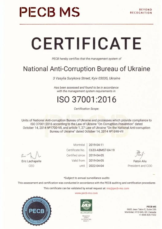 The audit findings were sent to the central office of the PECB Group Inc. (Montreal, Canada). The PECB Group Inc. made the final decision that the anti-corruption management system in the NABU meets the requirements of the international standard ISO 37001: 2016 and with the Law of Ukraine "On the Corruption Prevention" and "On the National Anti-Corruption Bureau of Ukraine".