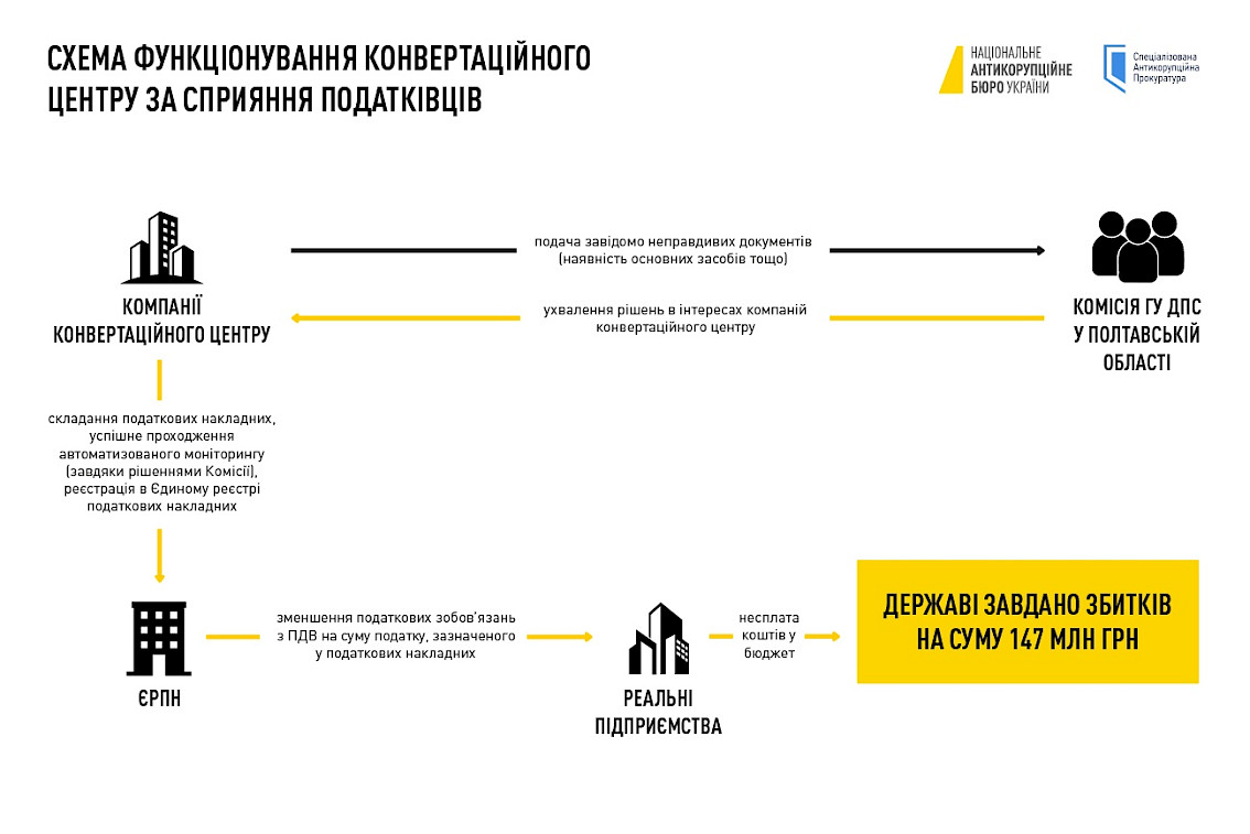 Слідство встановило, що тогочасний в.о. голови Державної податкової служби України сприяв безперешкодній діяльності конвертаційного центру, а заступниця начальника Головного управління ДПС у Полтавській області, яка очолювала комісію з питань зупинення реєстрації податкових накладних, забезпечувала ухвалення рішень на користь компаній конвертаційного центру.