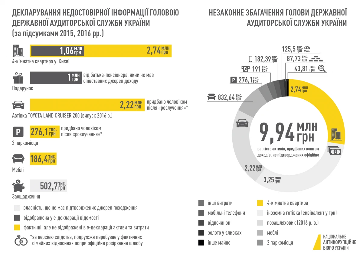 23 січня 2018 року детективи Національного антикорупційного бюро України під процесуальним керівництвом прокурорів Спеціалізованої антикорупційної прокуратури повідомили голові Державної аудиторської служби України про підозру у незаконному збагаченні в розмірі близько 10 млн грн та декларуванні недостовірних даних. Попередня правова кваліфікація — ч.3 ст.368-2, ст.366-1 Кримінального кодексу України. Повідомлення про підозру погоджене Керівником Спеціалізованої антикорупційної прокуратури України Назаром Холодницьким.