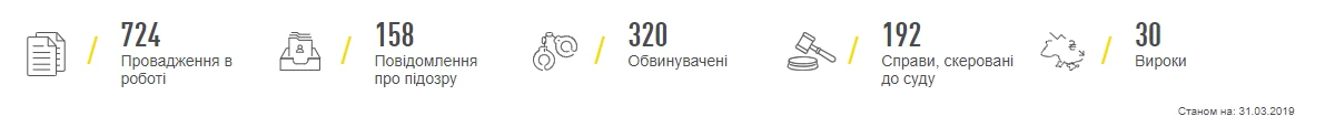 Детективи розслідують 724 кримінальні провадження, в межах яких 158 особам повідомлено про підозру у вчиненні кримінальних правопорушень. Такими є дані станом на 31 березня 2019 року.