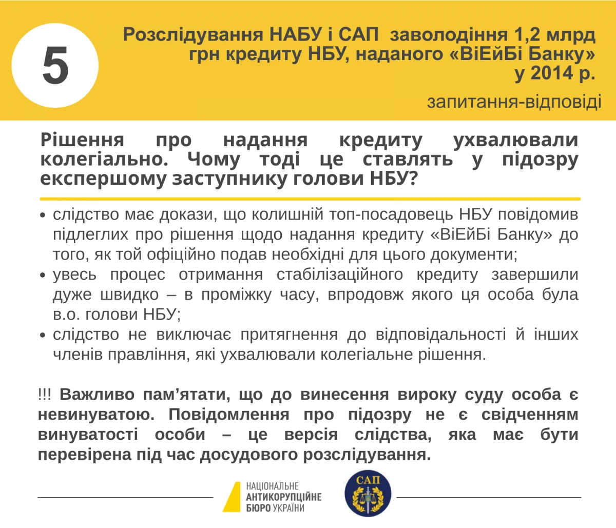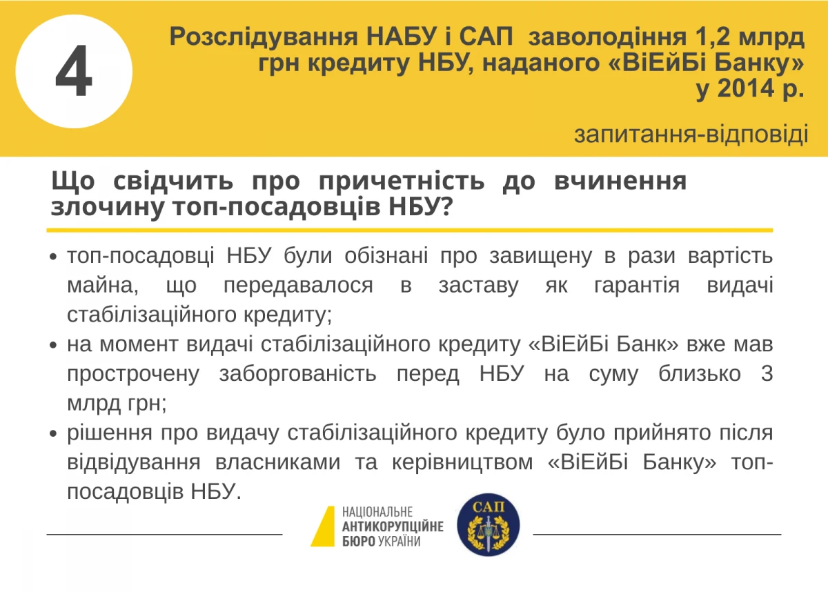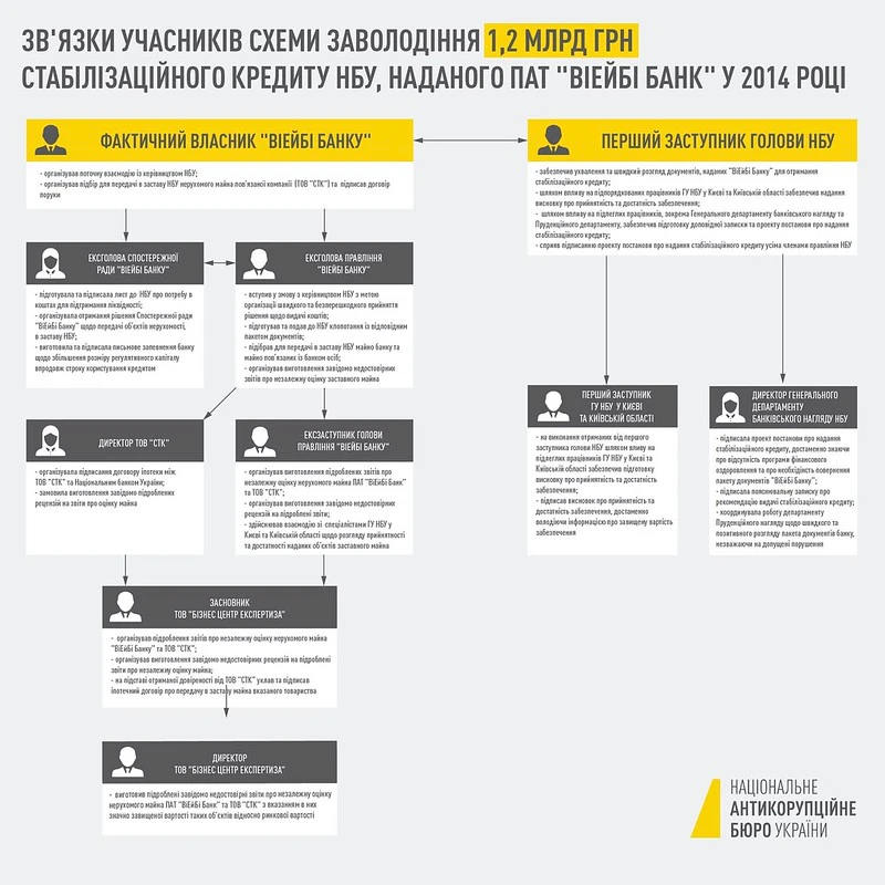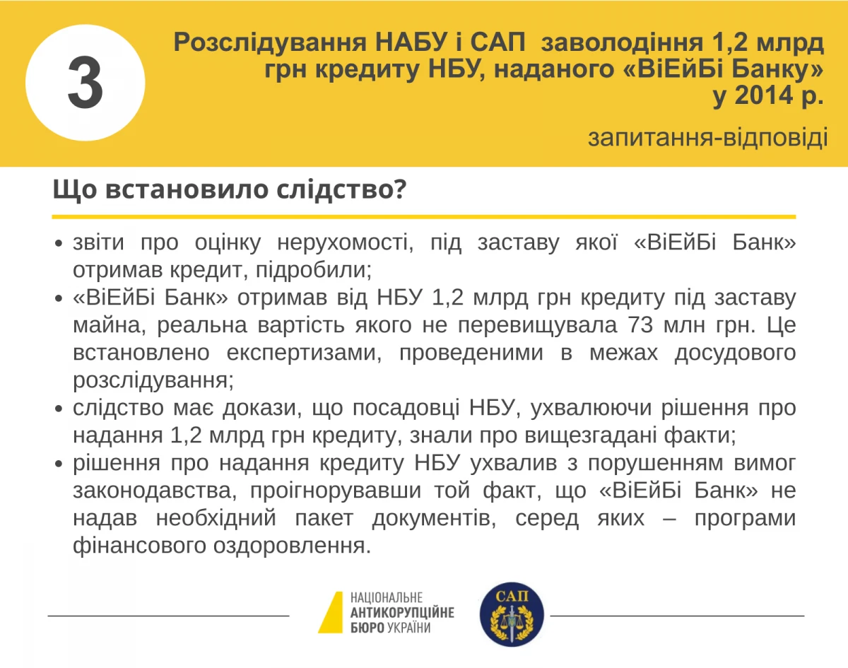 11-12 листопада 2019 року детективи Національного бюро під процесуальним керівництвом прокурорів САП повідомили восьми особам про підозру у заволодінні 1,2 млрд грн стабілізаційного кредиту, наданого Національним банком України ПАТ «ВіЕйБі Банк».